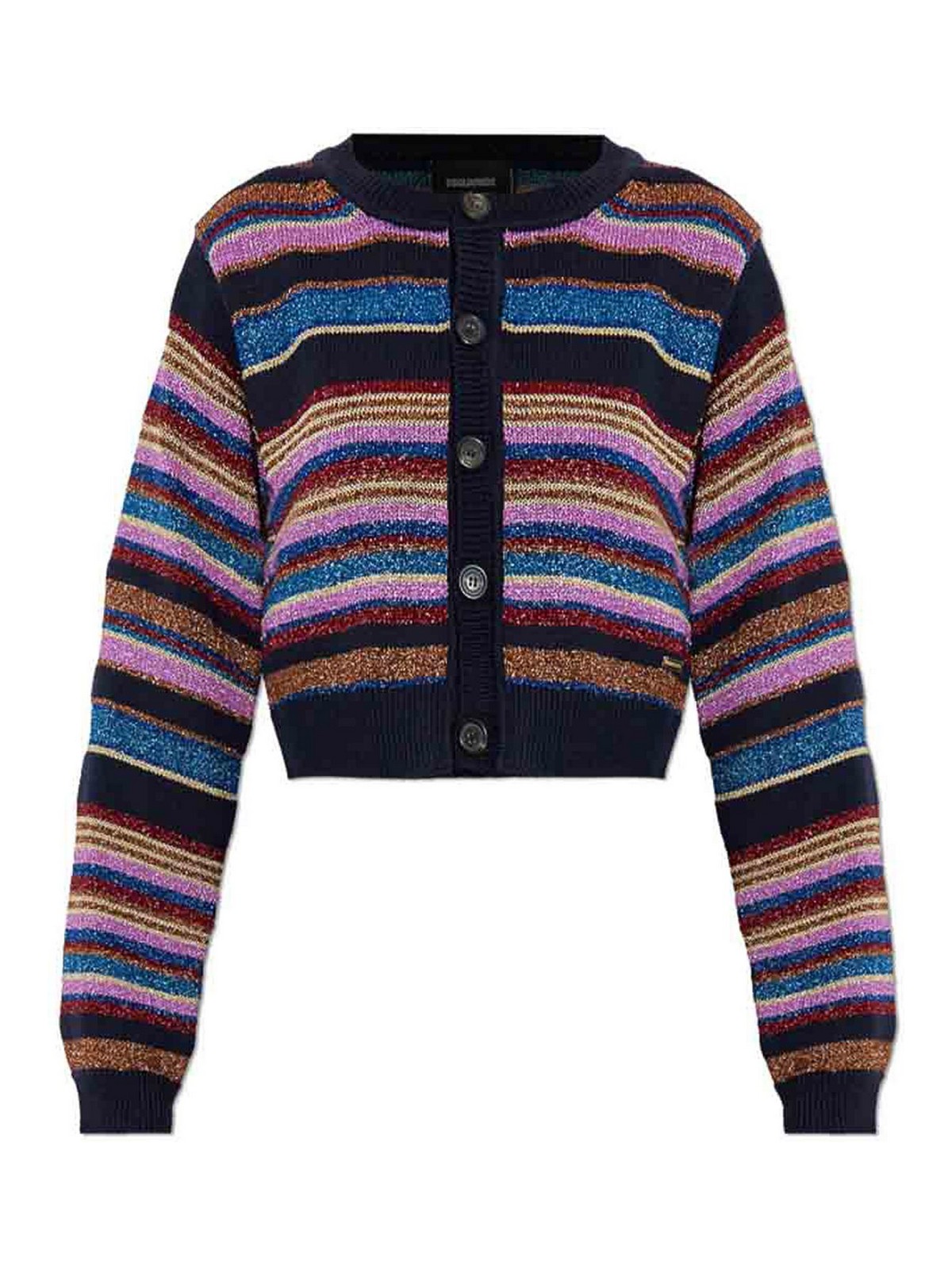 Dsquared2 multicolor cardigan with multicoloured horizontal stripes in intense, contrasting shades, embellished with sparkling threads. short and slightly oversized, it reaches the waist, while the long sleeves are well defined with ribbed cuffs.