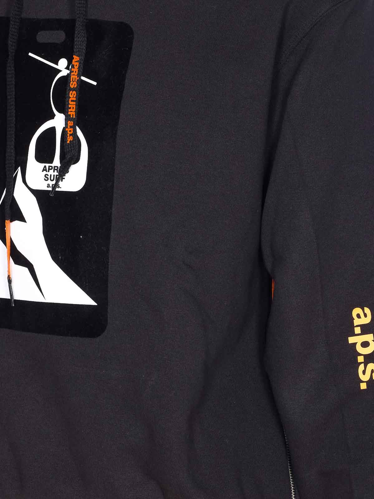Apres surf black pordoi hoodie, print on the front, on sleeves and on the back, lateral zip detail, coulisse on waist, hood detail