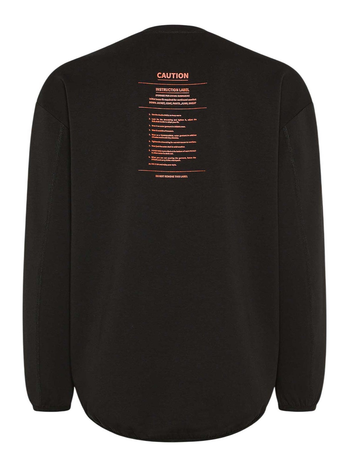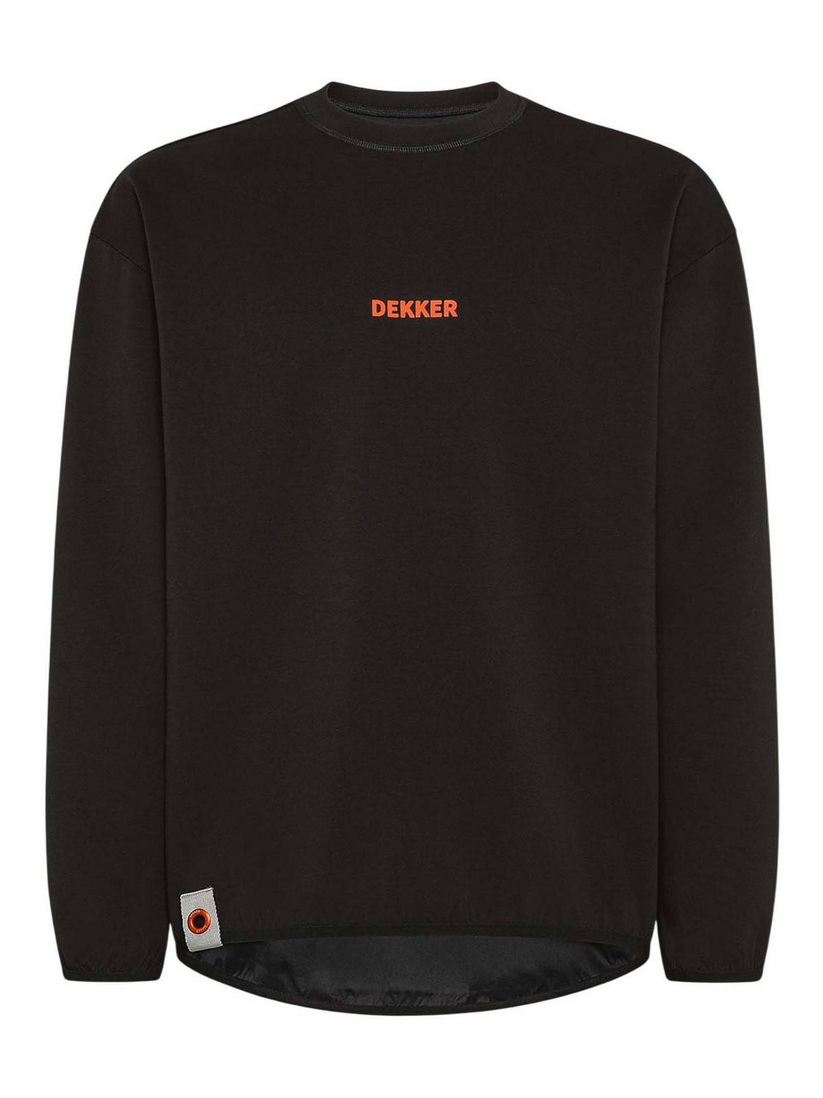 Dekker alligator oversized scuba sweatshirt with logo / black oversized sweatshirt with a contemporary and bold design, made of a cotton, polyamide and elastane blend of scuba fabric, for a soft, compact and extremely comfortable feel. the asymmetrical construction, shorter on the front and longer on the back, gives the garment a dynamic and modern character. the contrasting central logo print and the caution print on the back express a bold graphic aesthetic. Iconic details such as the jumper with metal porthole at the bottom of the garment and the orange logo ribbon applied on the back complete the sweatshirt with the unmistakable Dekker signature. practical and versatile, perfect to wear alone or layered to add a distinctive touch to urban looks. fit: regular main fabric: 45% cotton, 45% polyamide, 10% elastane details: front logo print, caution print on the back, jumper with metal window, orange logo ribbon asymmetrical bottom (shorter at the front, longer at the back) mood: informal