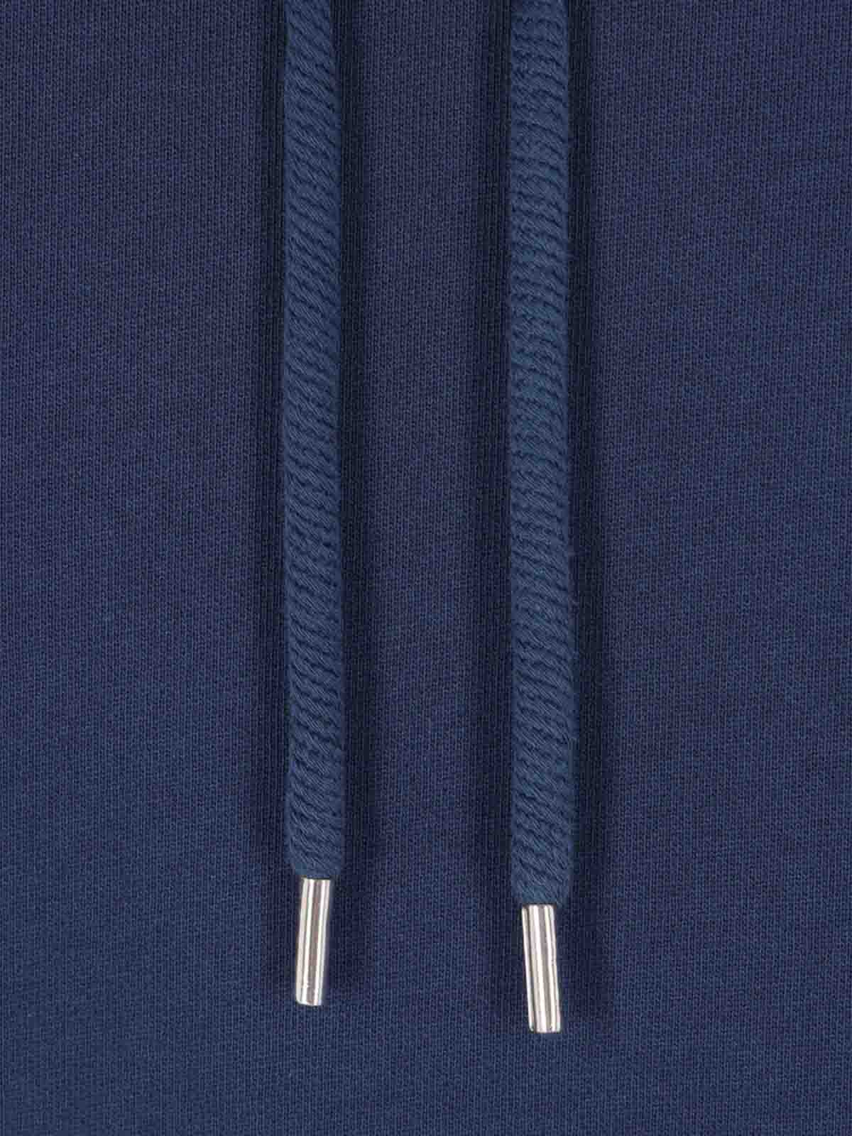Navy blue logo drawstring hood long sleeves ribbed cuffs construction