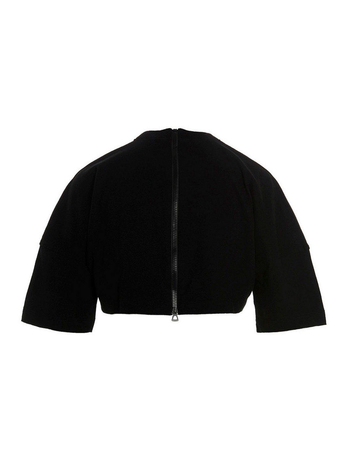 Cotton, crewneck t-shirt with front logo print, short sleeves, cropped style and a back zip detail.
