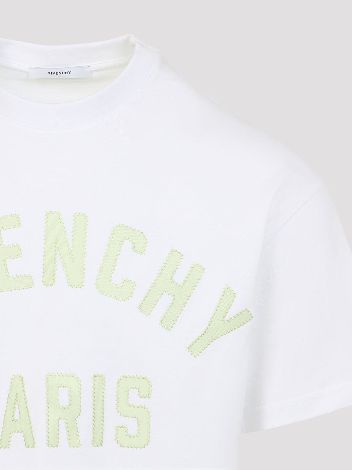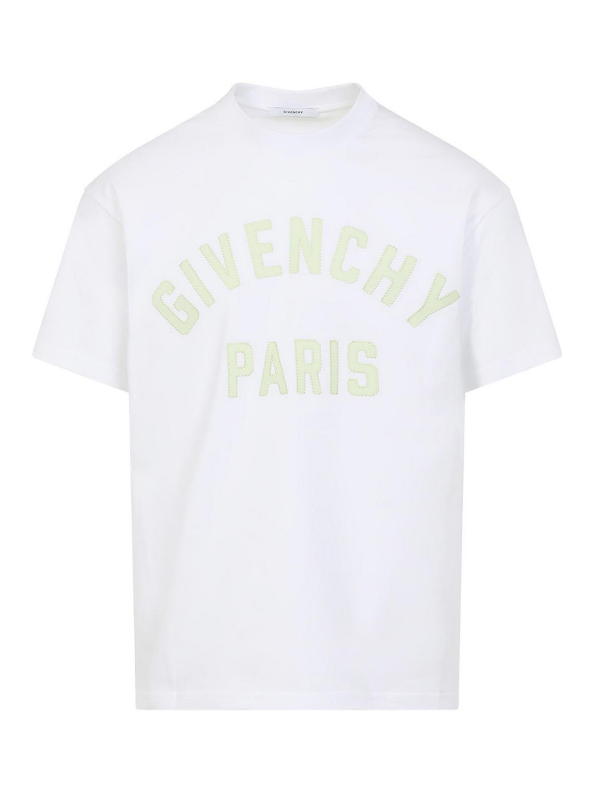 Givenchy white and green cotton t-shirt. pure white cotton t-shirt, round neck, front green tonal lettering logo, short sleeves, tonal stitching, straight hem.