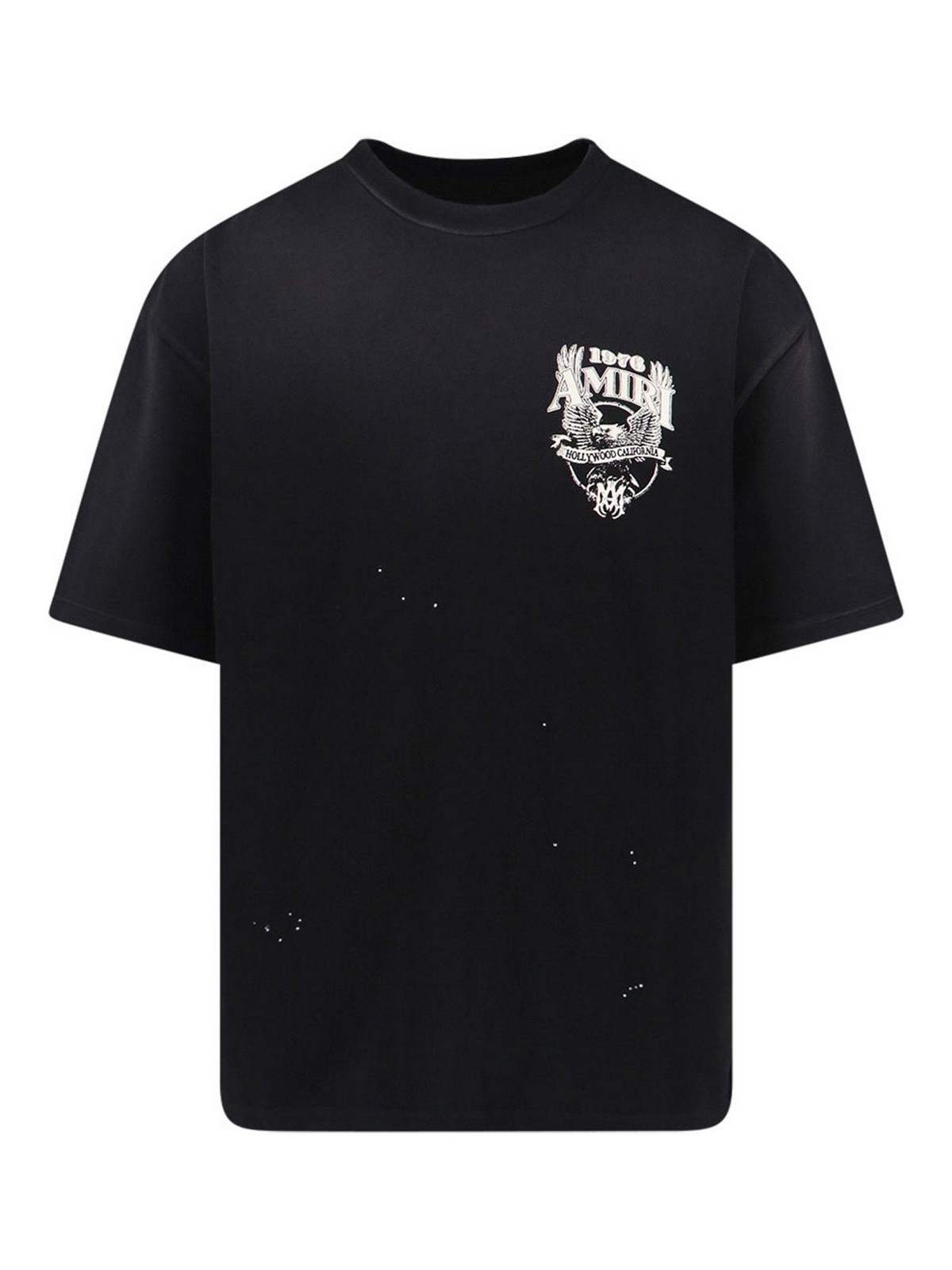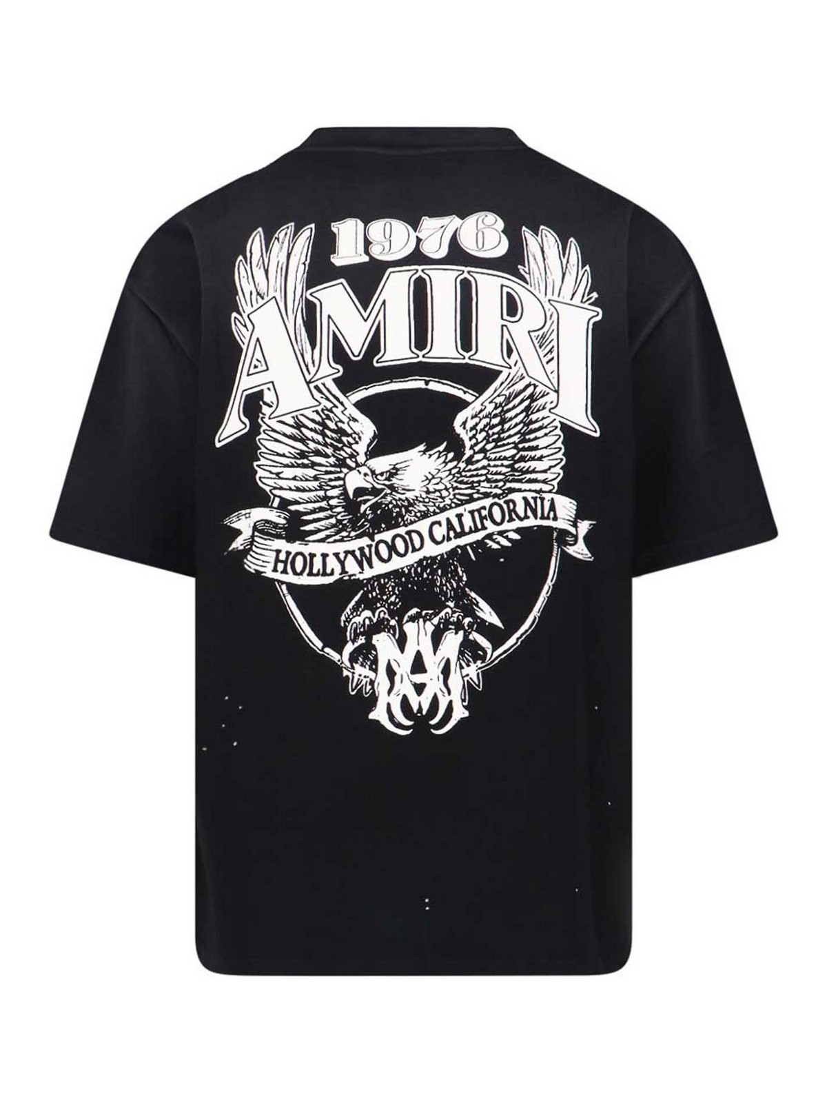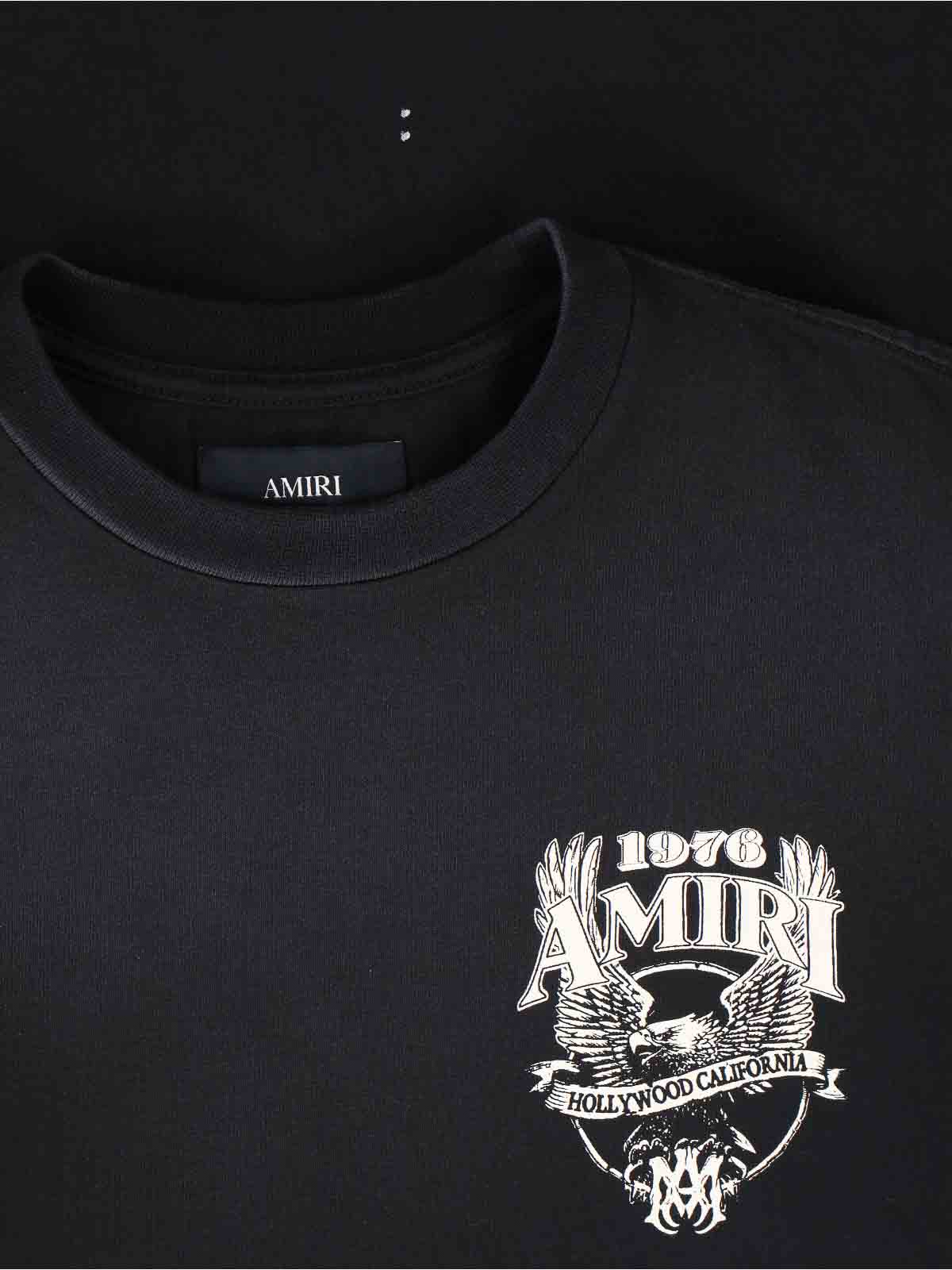 Amiri logo T-shirt in black cotton, crew neck, short sleeves, dropped shoulders, contrasting print detail on the front and back, straight hem.