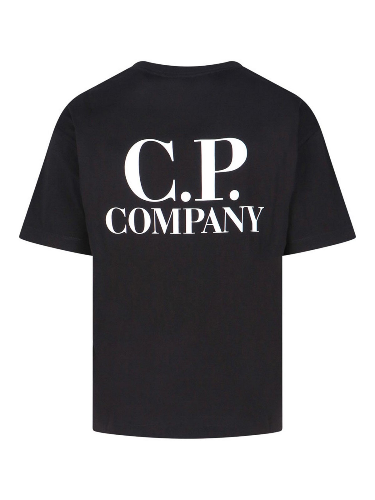 c.p. logo t-shirt company, in black cotton, crew neck, short sleeves, front logo print, maxi logo print on the back, straight hem.