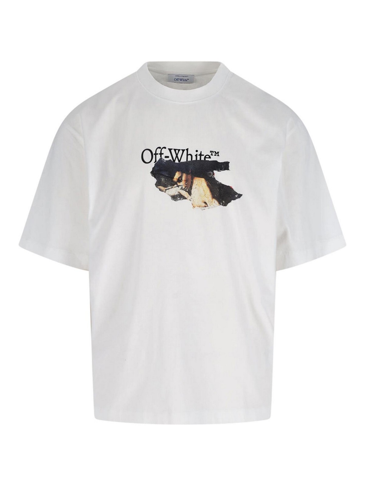 Off-white paint arrow T-shirt, in white cotton, crew neck, dropped shoulders, short sleeves, multicolor logo print on the front, maxi multicolor logo print on the back, ribbed finishes, straight hem.