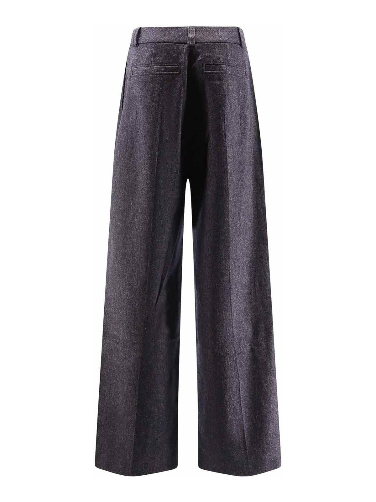 Zip, button and hook closure side welt pockets welt pockets on the back wide leg 57% polyester 26% wool 15% viscose 2% elastane