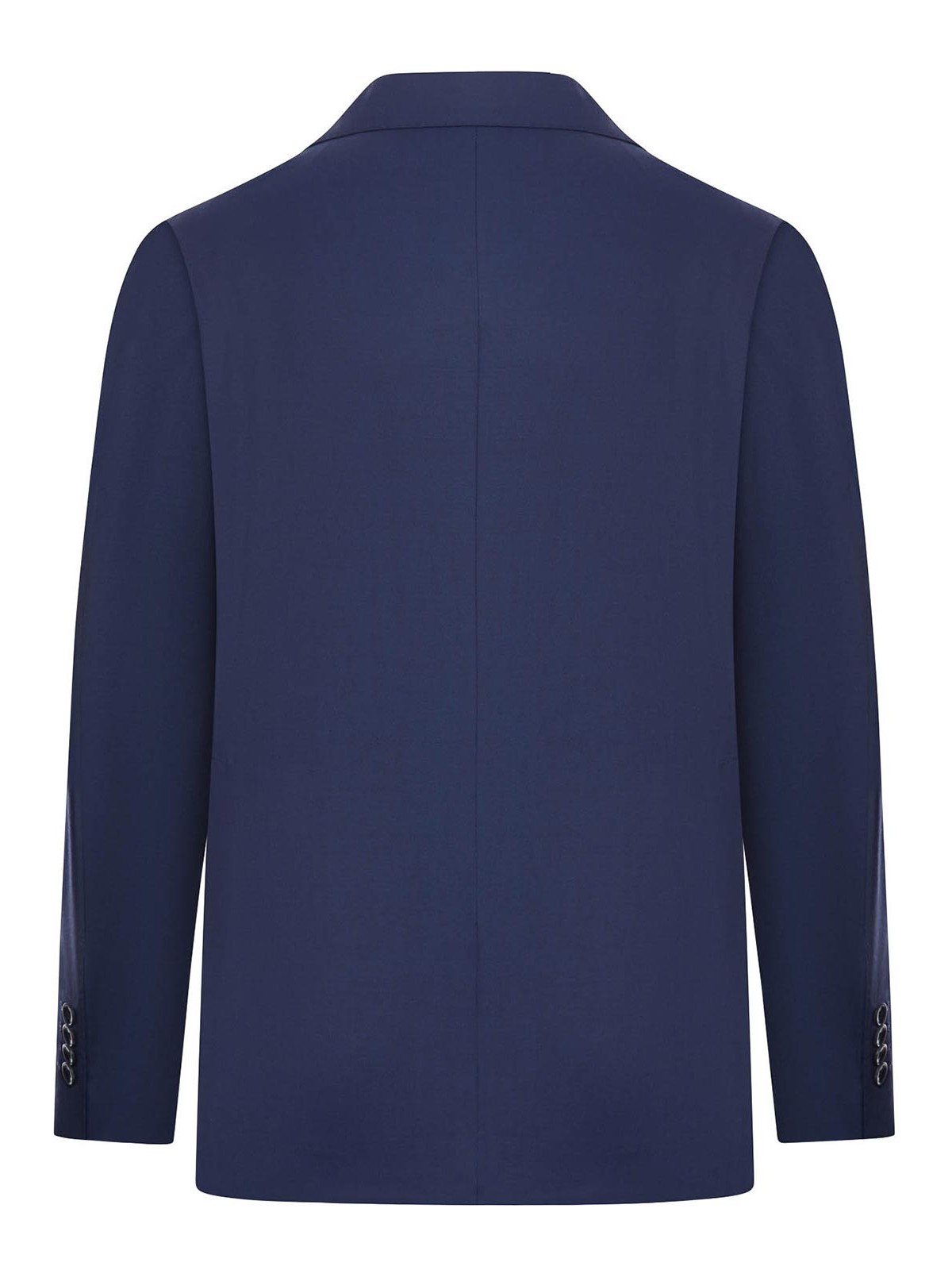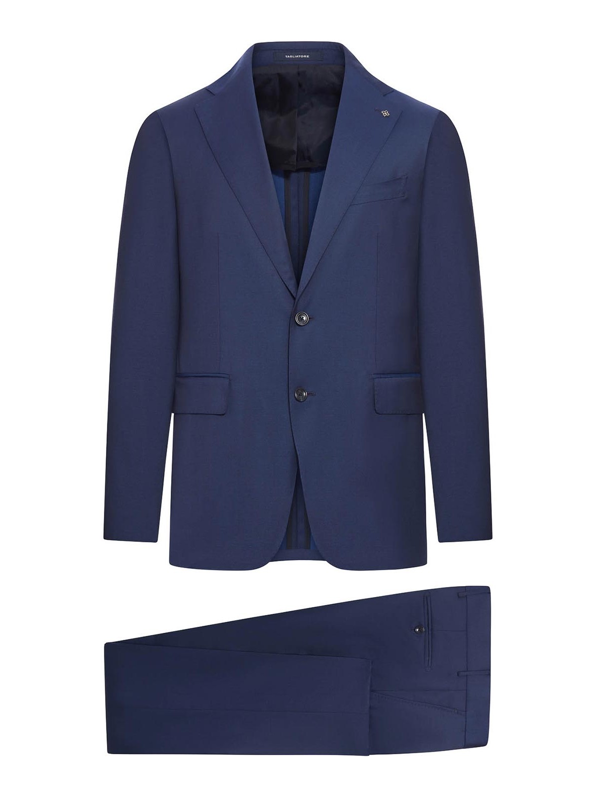 Single-breasted jacket- classic collar and lapels- logo pin- welt pockets with flaps- buttoned cuffs- back vents- unlined- slim-fit trousers- belt loops- zip and button closure- side pockets- back welt pockets- color blue