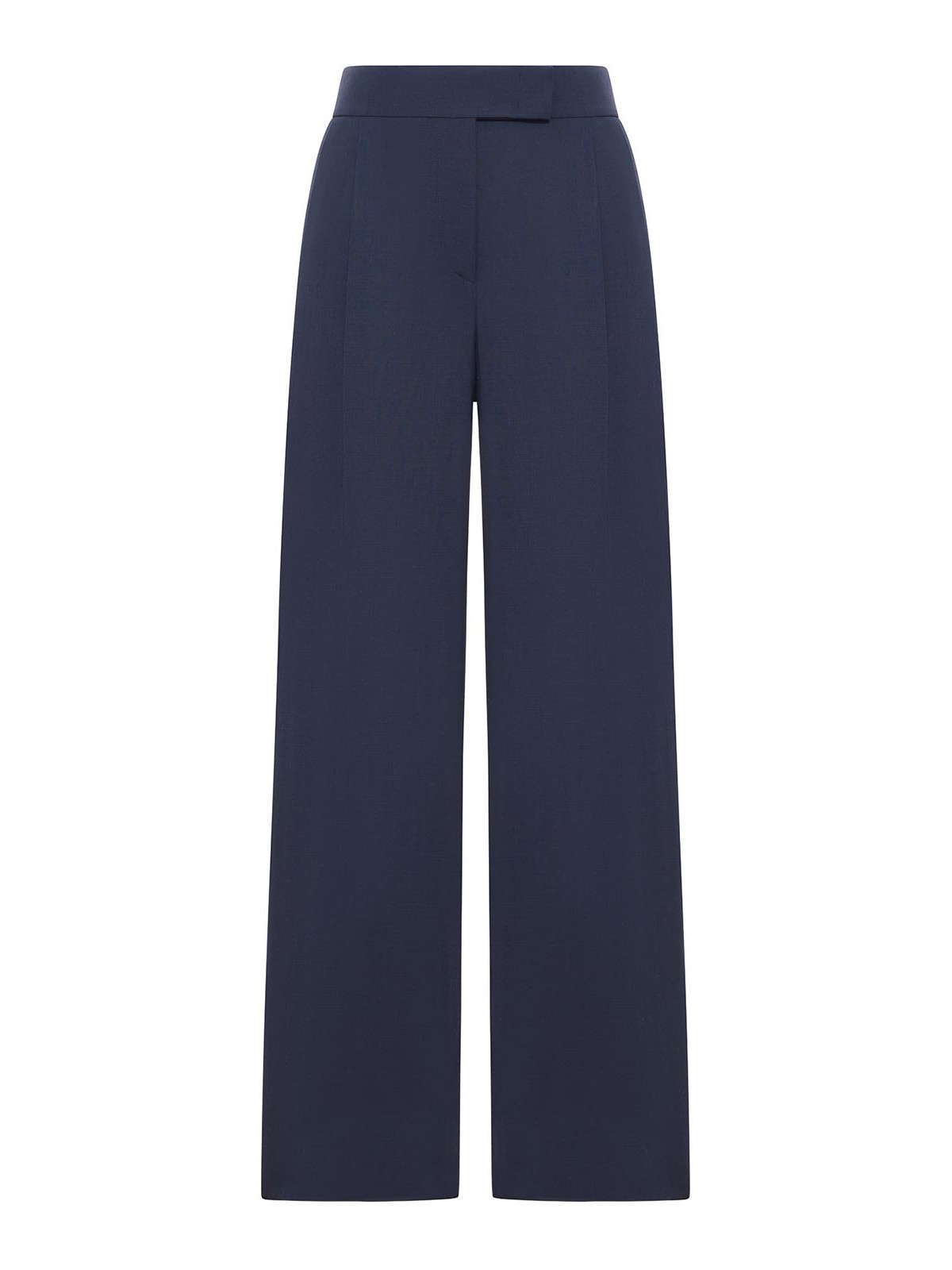 High waist, concealed zip and hook, pleats, two inset hip pockets, one welt pocket on the back, - color blue