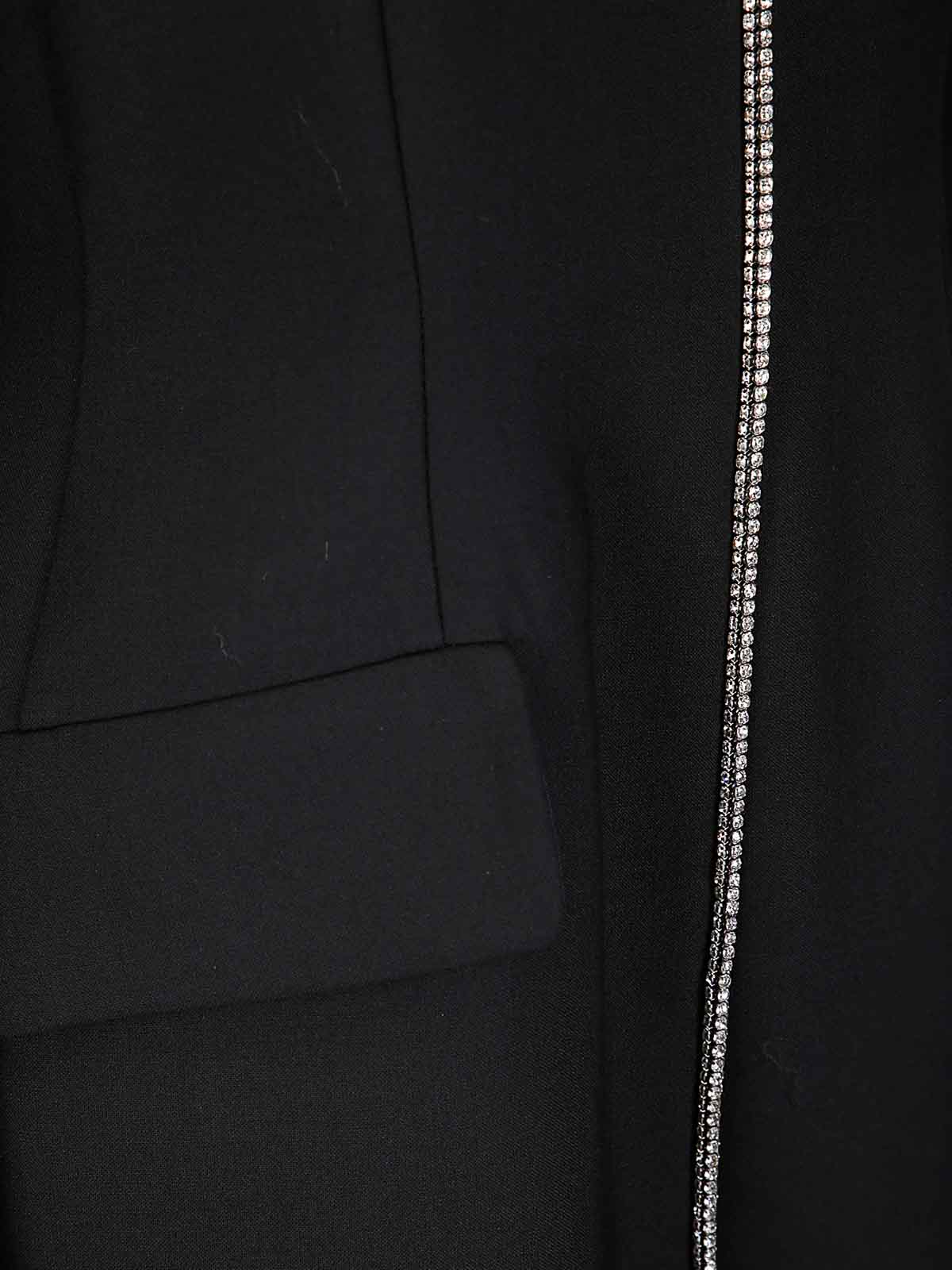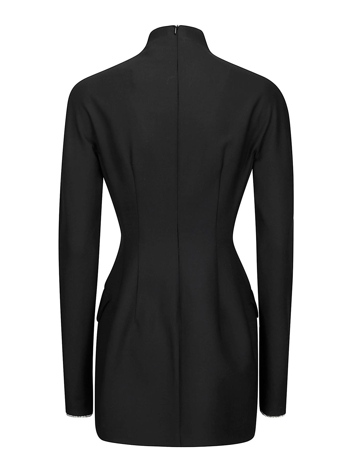 Slim fit black top with front glitter, rear zip closure, high collar, front pockets.
