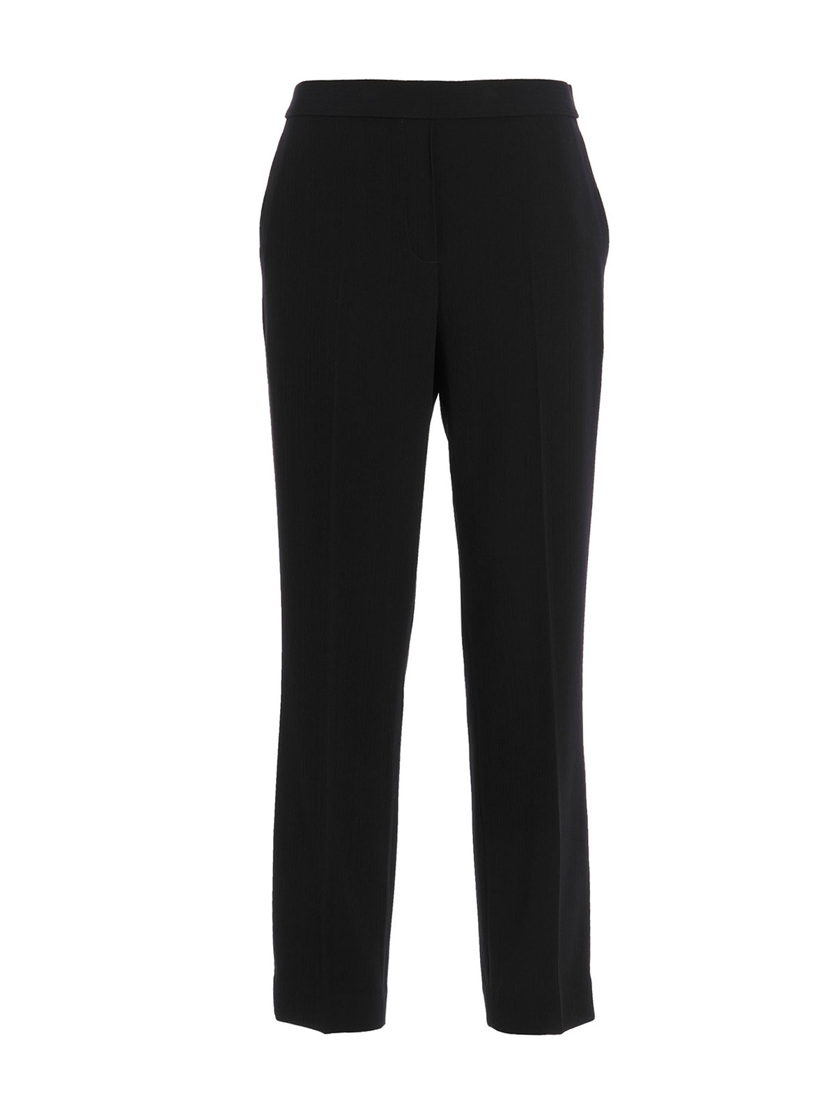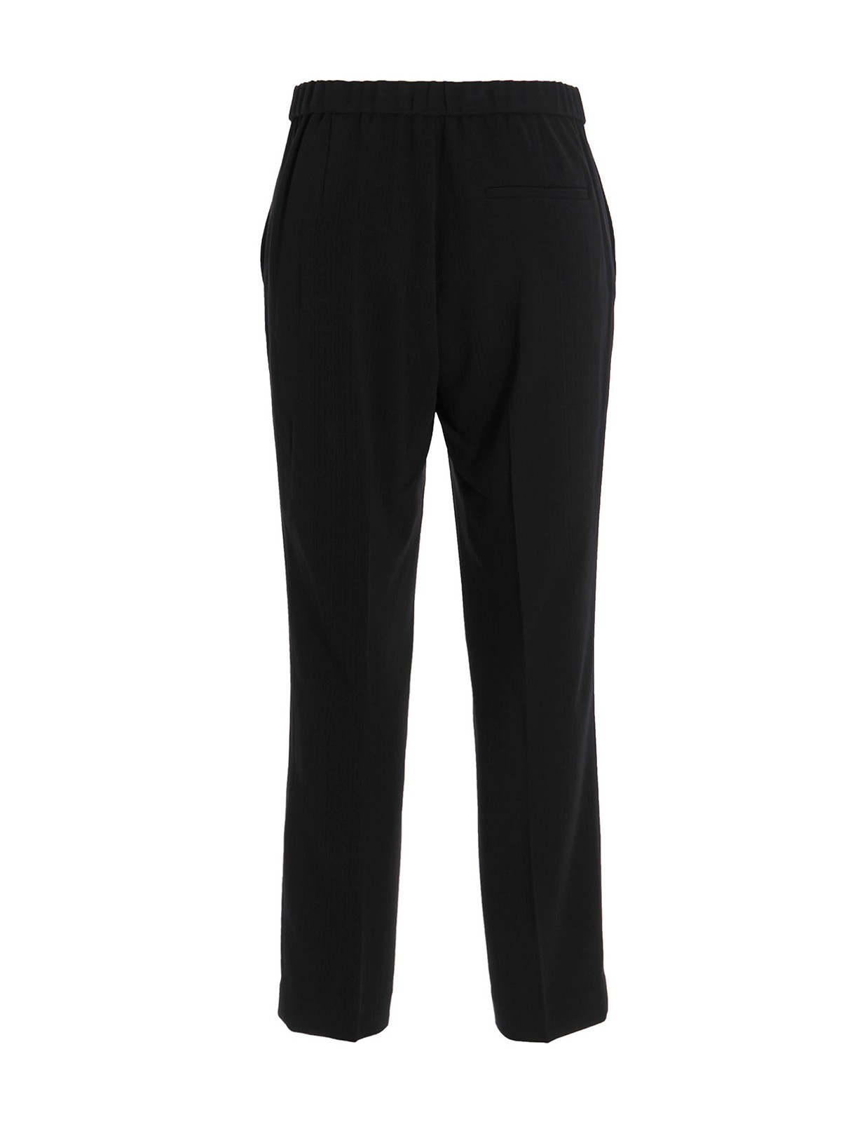 Texture pants detailed with elastic at waist, straight leg and central crease.