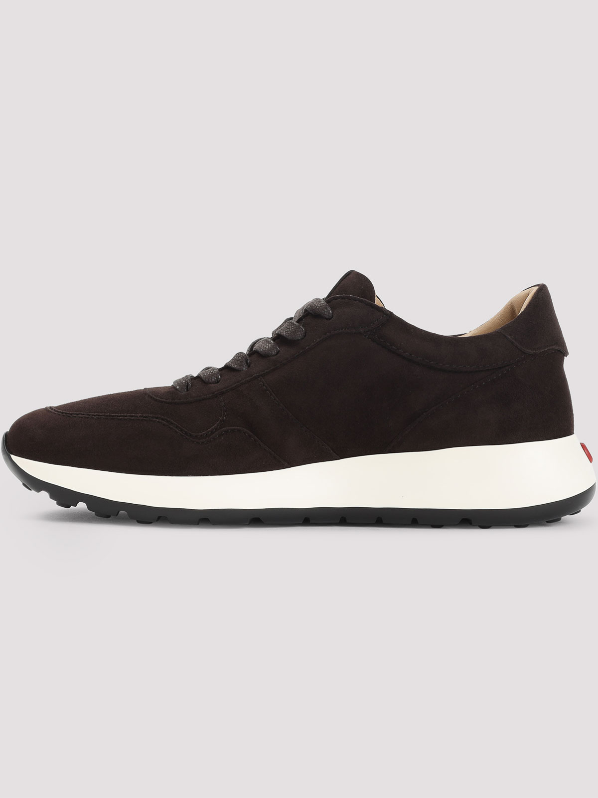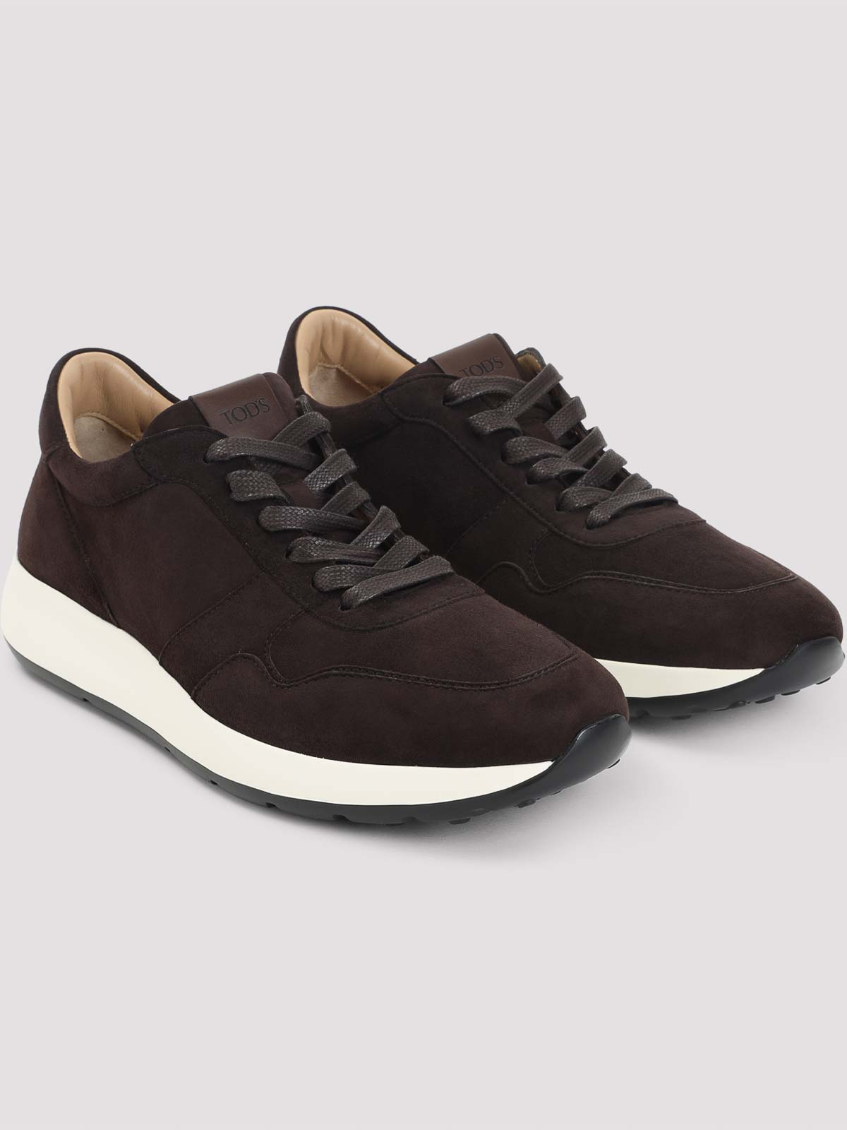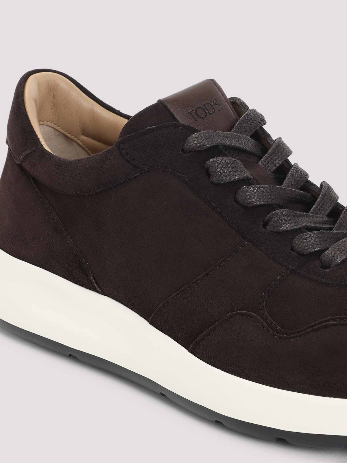 Tod`s brown suede leather sneakers. multi-layer brown leather vamp, round toe, lace-up fastening, leather label with lasered logo on the tongue, leather lining and insole, red dot detail on the back of the white rubber midsole, black outsole with rubber pebbles.