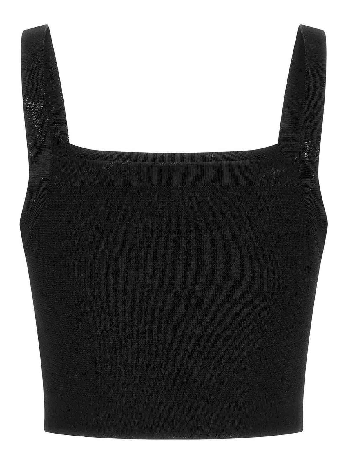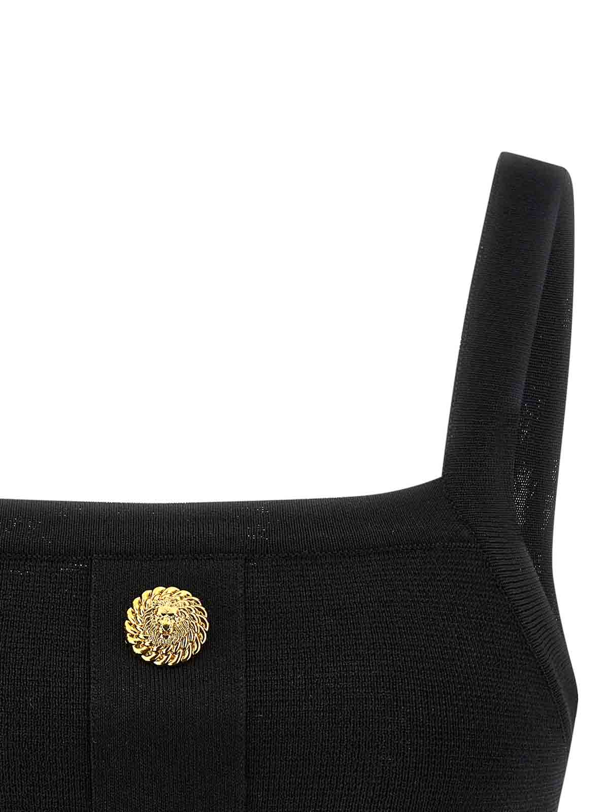 Shiny effect viscose knit top with 3 front 'testa di leone' cropped button detail with thin straps.