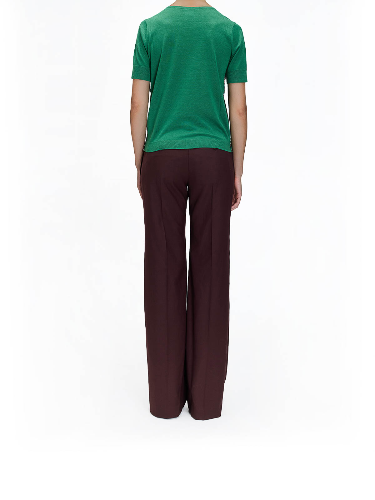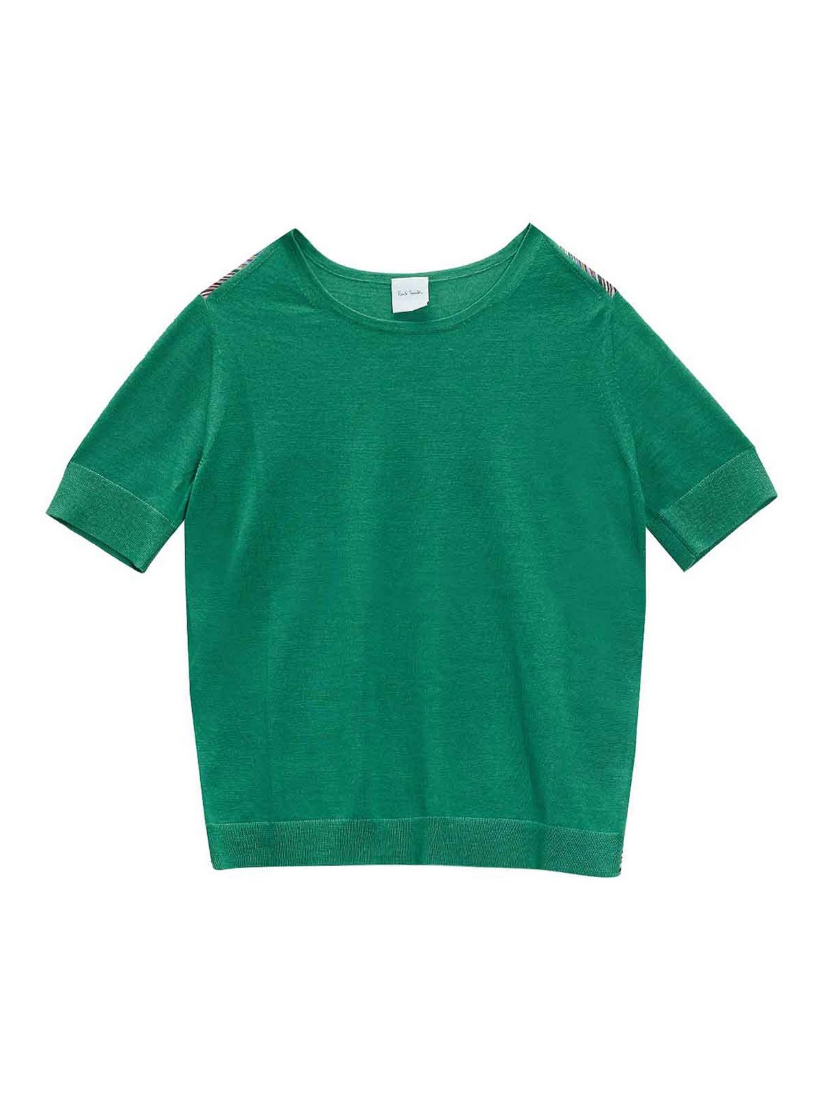 Wool and silk top with striped trim. Lightweight wool knitted T-shirt by Paul Smith, embellished with a signature stripe motif on the seams and a ribbed crew neck and hem. Short sleeves, knitted, signature stripe motif on the seams, ribbed crew neck, sleeves, and hem. Color: green. 75% wool, 25% silk