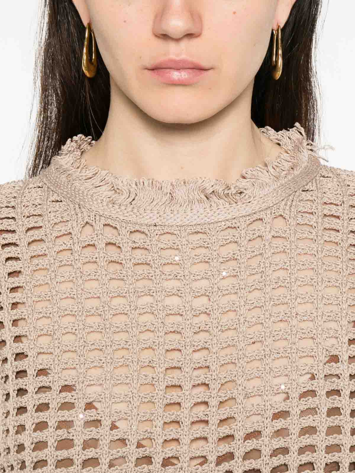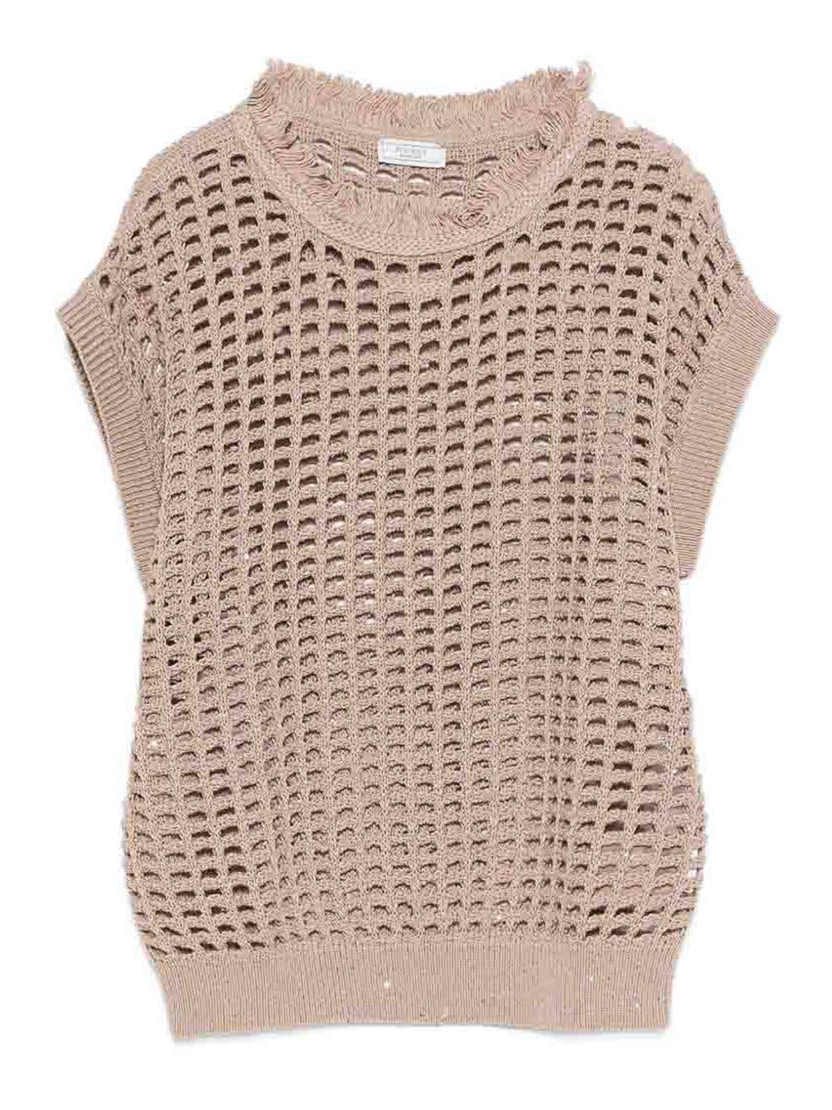 Beige open knit fringed trim round neck short sleeves sequin detail