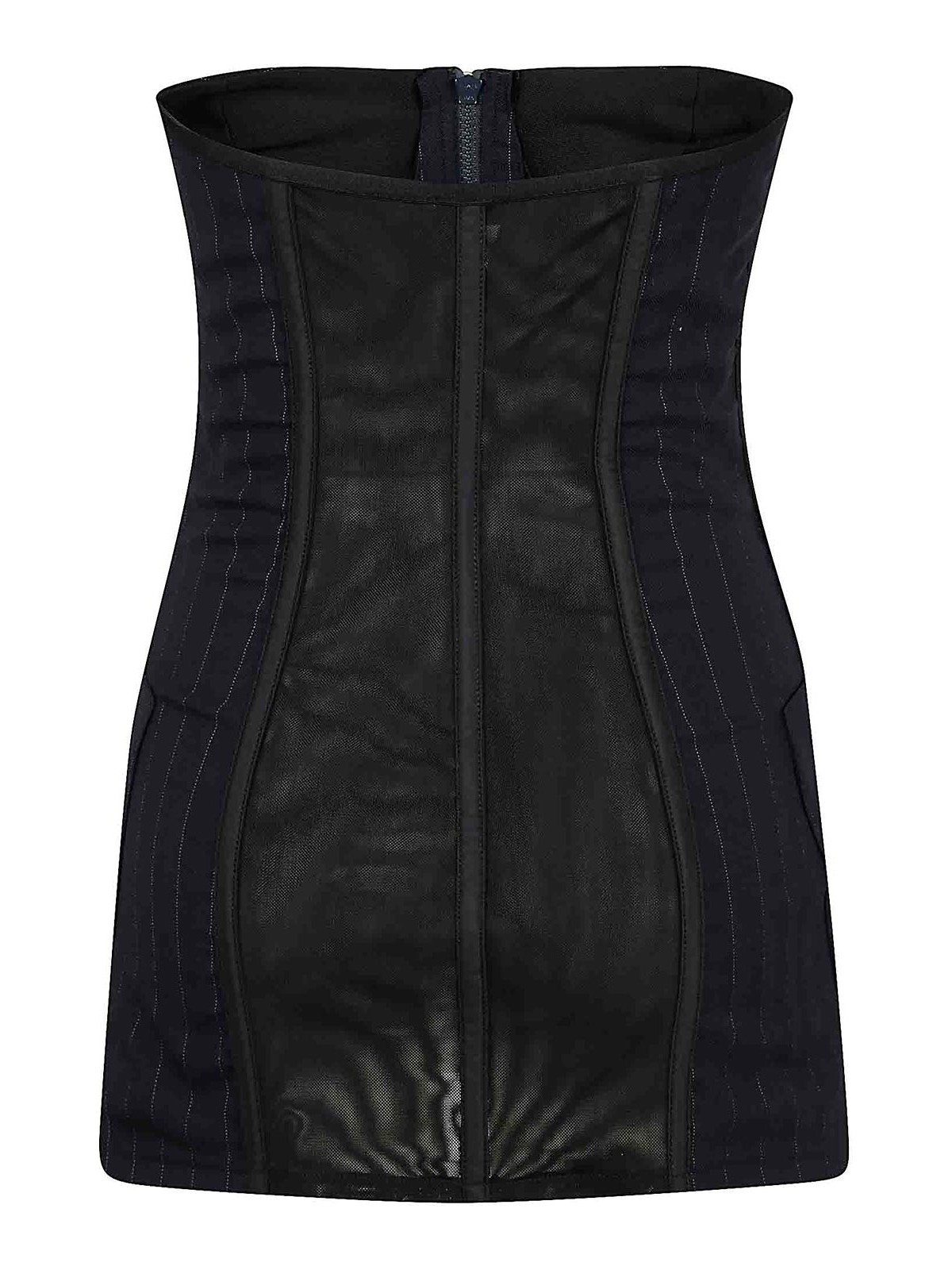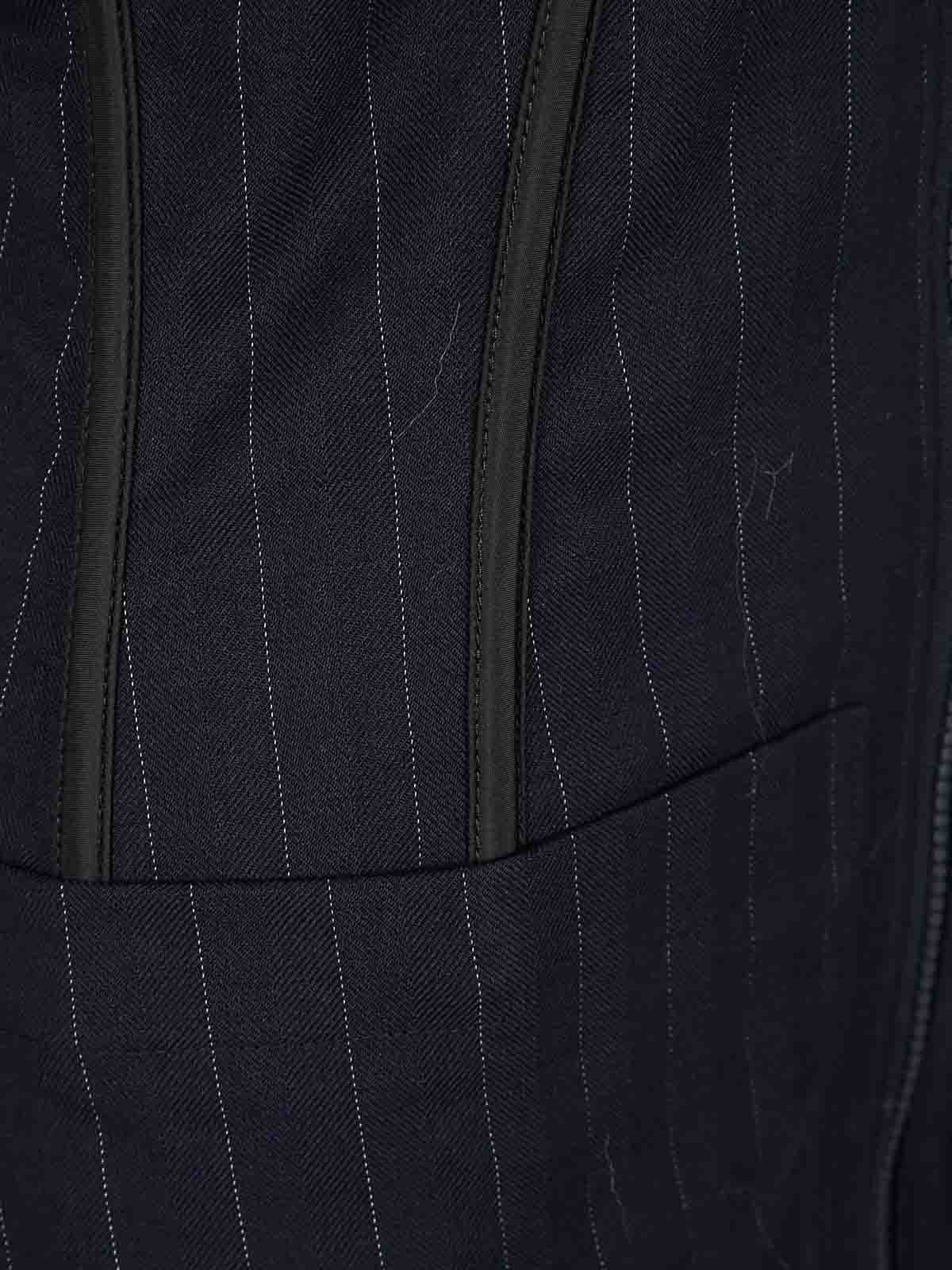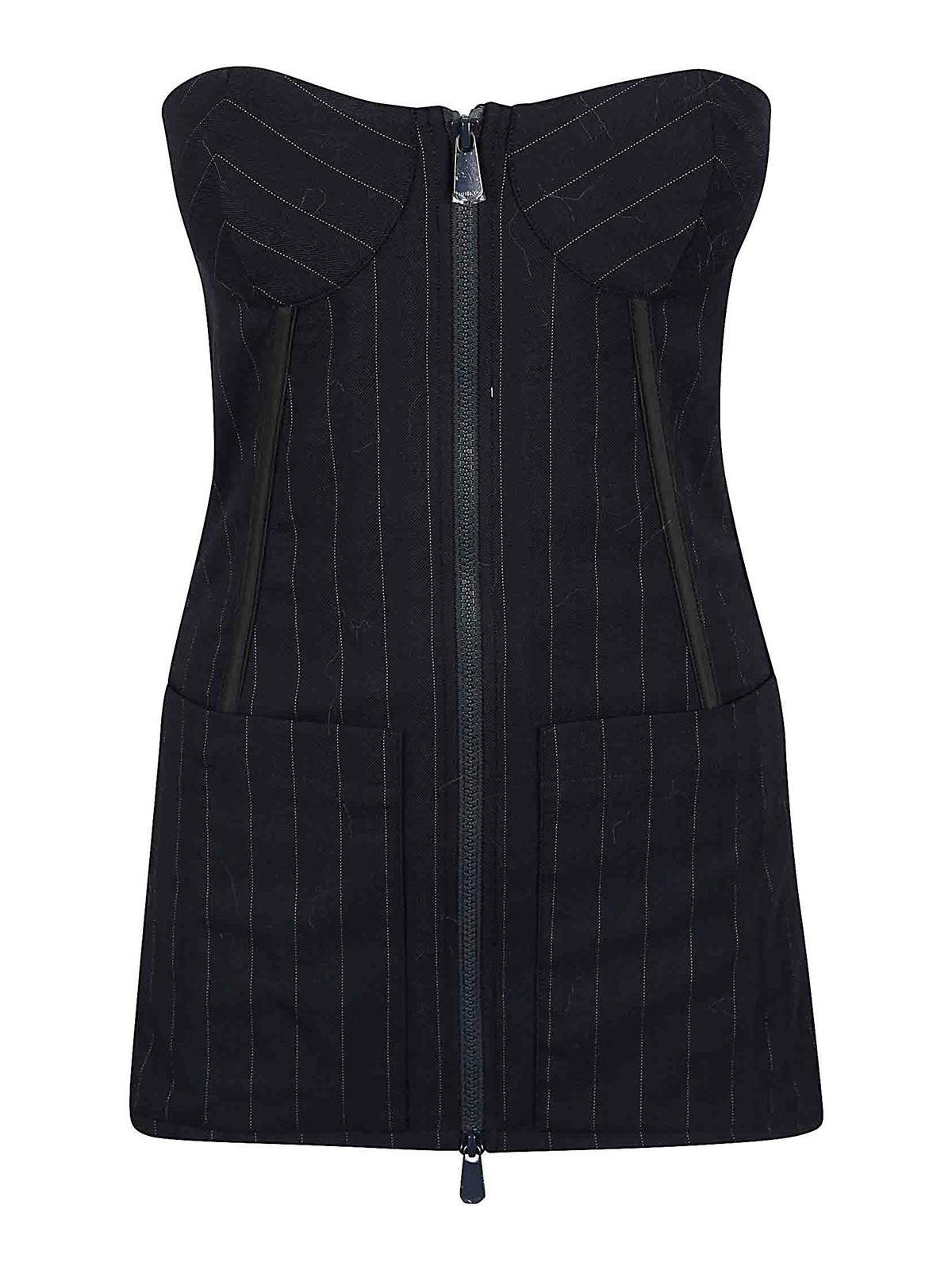 Pinko pinstriped poly wool top, slightly sweetheart neckline, molded cups, and a double-slider front zip closure. Structured design, inspired by a vintage garment, entirely supported by external stays that create graphic lines contrasting with the pinstriped fabric lined with stretch fabric.