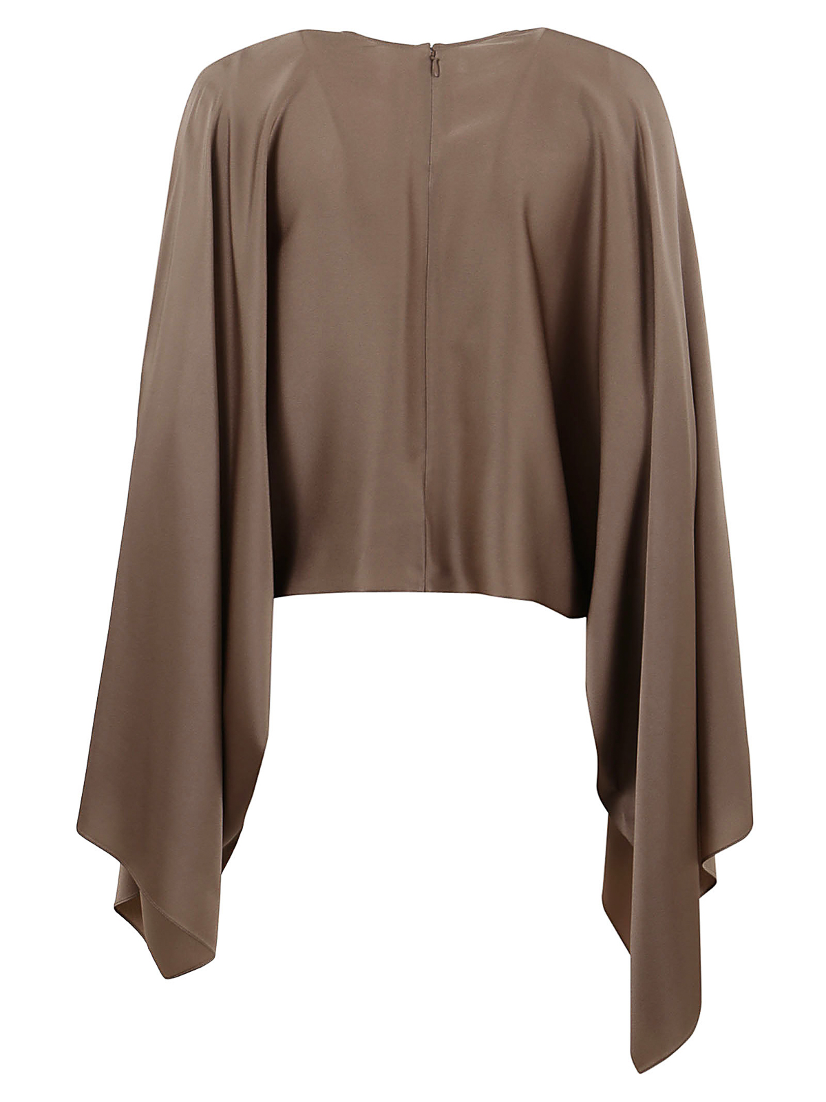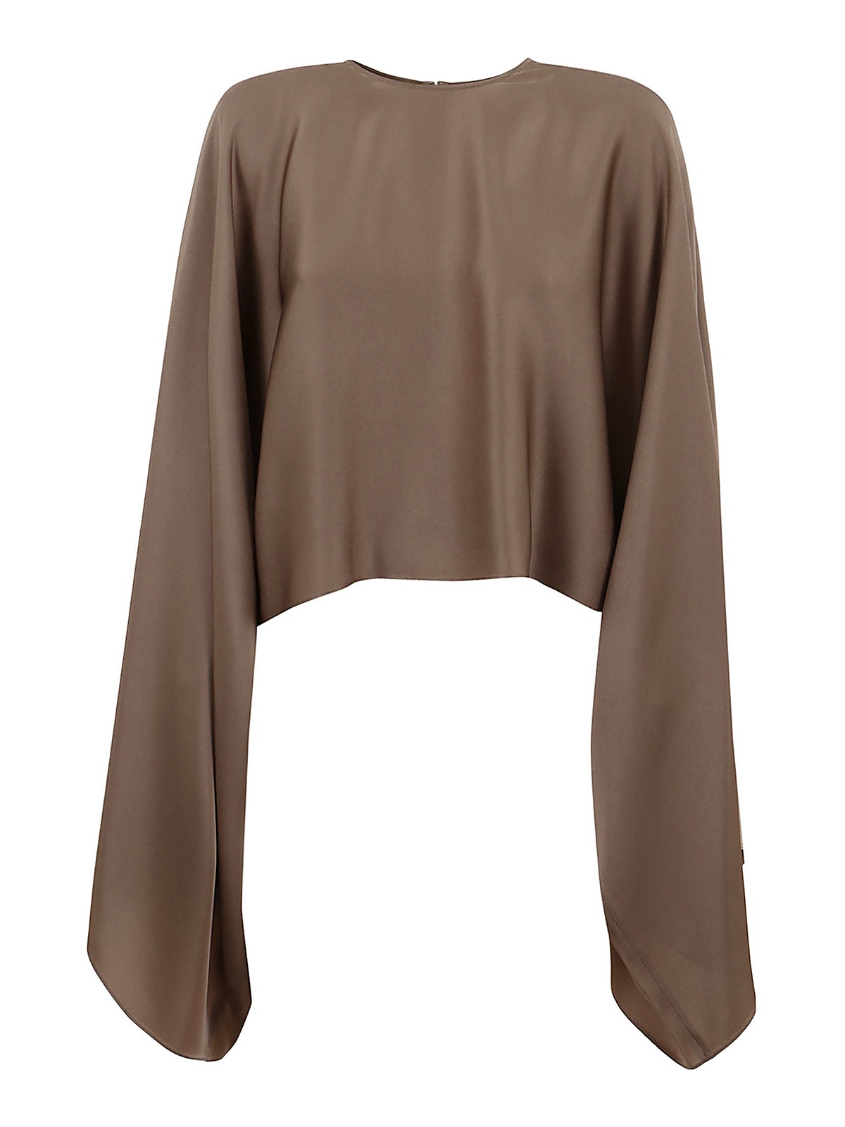 Taupe round neckline concealed back zip closure extra-long sleeves draped design crop design and straight hem