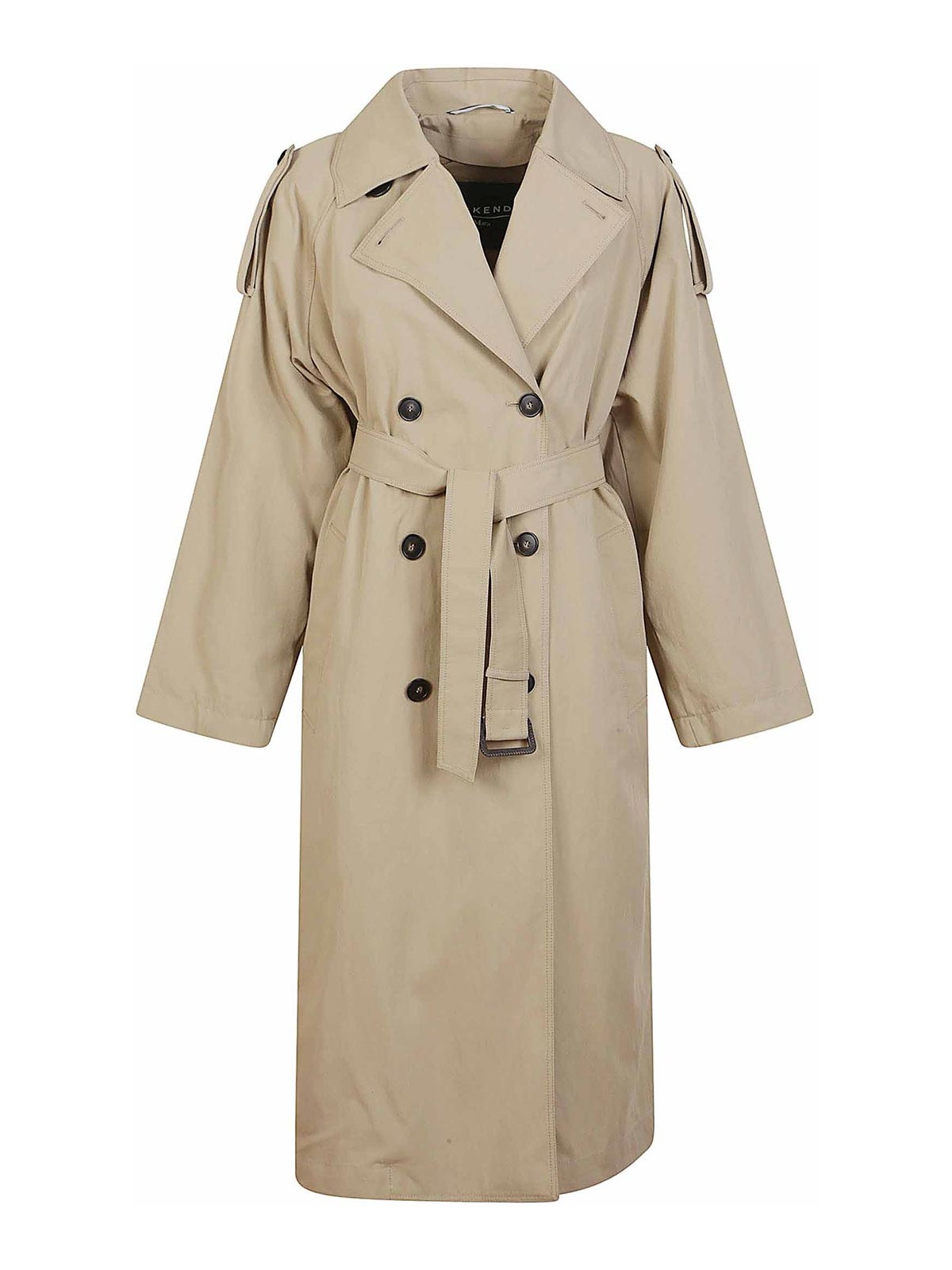 Double-breasted raincoat in nylon, beige colour, button fastening, frogs on the sleeves and cuffs, welt pockets, central rear vent, belt at the waist, removable internal padding.