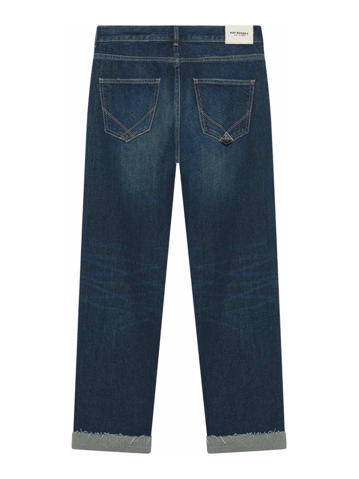 Roy rogers old glory women's jeans new oskar kyra in dark wash denim with used effect women's jeans by roy rogers from the old glory line, made of denim with dark wash and light used effect with tears. the new oskar kyra model features a medium waist with belt loops, closure with logoed buttons and roy rogers label applied on the back. the two pockets on the front and the two on the back with brand labels complete the design with authentic, handcrafted details. the raw cut hem with micro reverse adds a bold touch, while the boyfriend cut guarantees comfort and a relaxed look with an urban style.