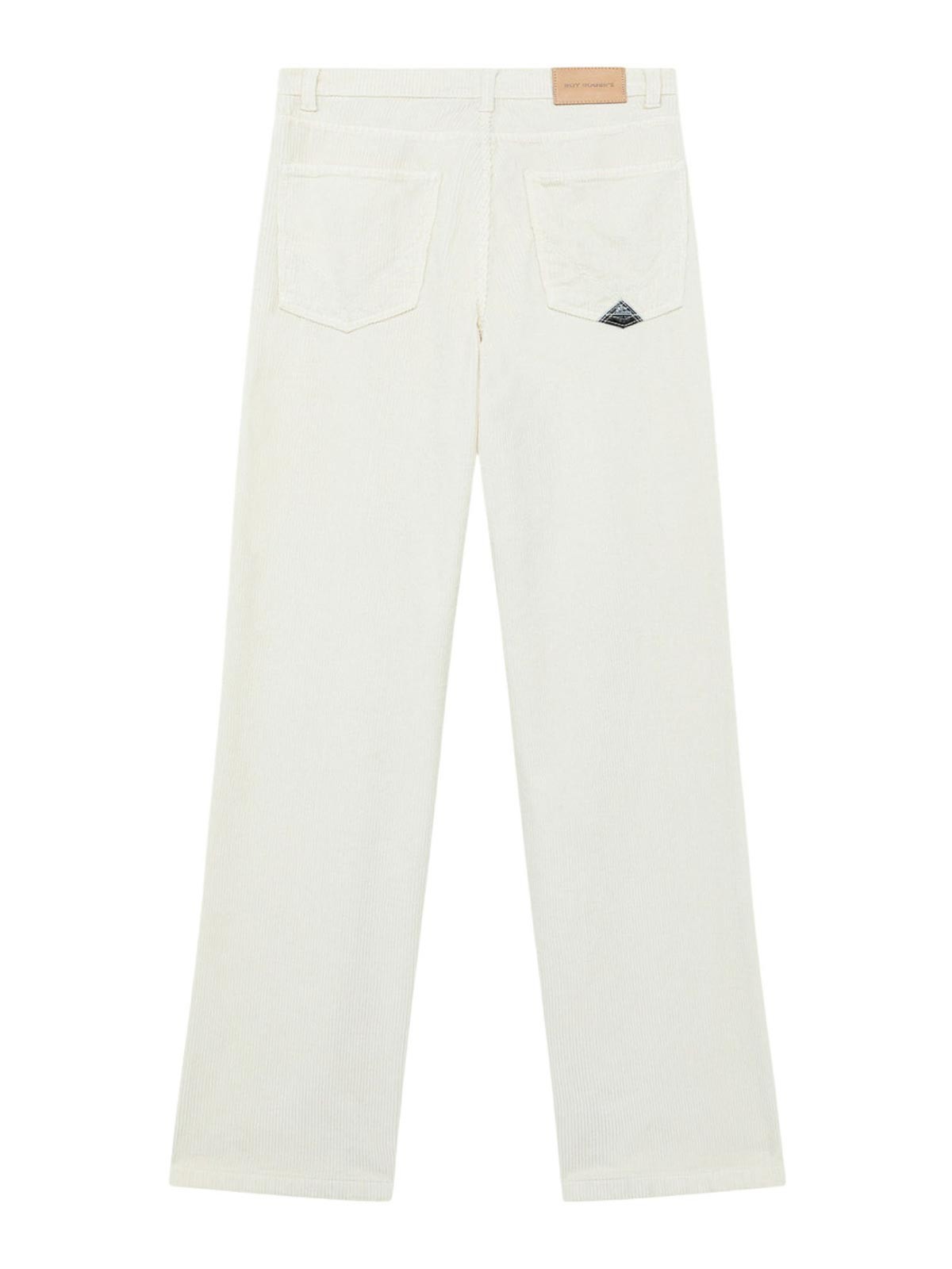 Roy rogers marta women's trousers in white corduroy women's trousers by roy rogers made of solid color corduroy, with a soft and refined touch. the marta model, characterized by a medium waist with belt loops and logoed button and zip closure, stands out for its flared silhouette which slims the figure and enhances feminine style. the two pockets on the front and the two on the back with applied Roy Rogers label complete the garment with the iconic details of the brand. an elegant and contemporary trousers, ideal for casual or more sophisticated looks. main features made of solid color corduroy medium waist with belt loops closure with logo button and zip two front and two back pockets with roy rogers label applied on the back flare fit waist white color composition 78% cotton 20% modal 2% lyocell