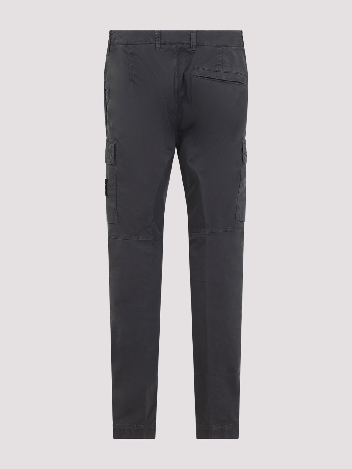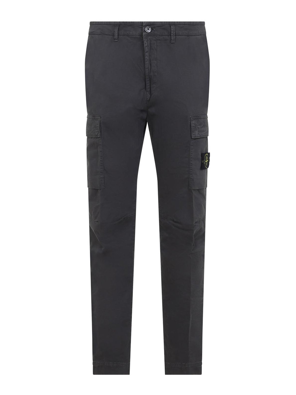 Stone island charcoal cotton trousers. crafted in cotton and elastane blend. front concealing zipped fastening, front buttoned fastening, belt loops, back slit pocket, side cargo flap pockets along the legs, patch logo on the right leg, straight hem.