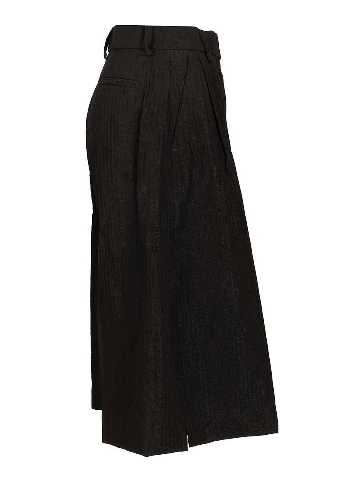 Thelatest dakota trousers extremely wide leg deep box pleats a small side slit on the bottom of each leg high waist belt loops clean with zip and concealed hook and two horizontal welt pockets at the back