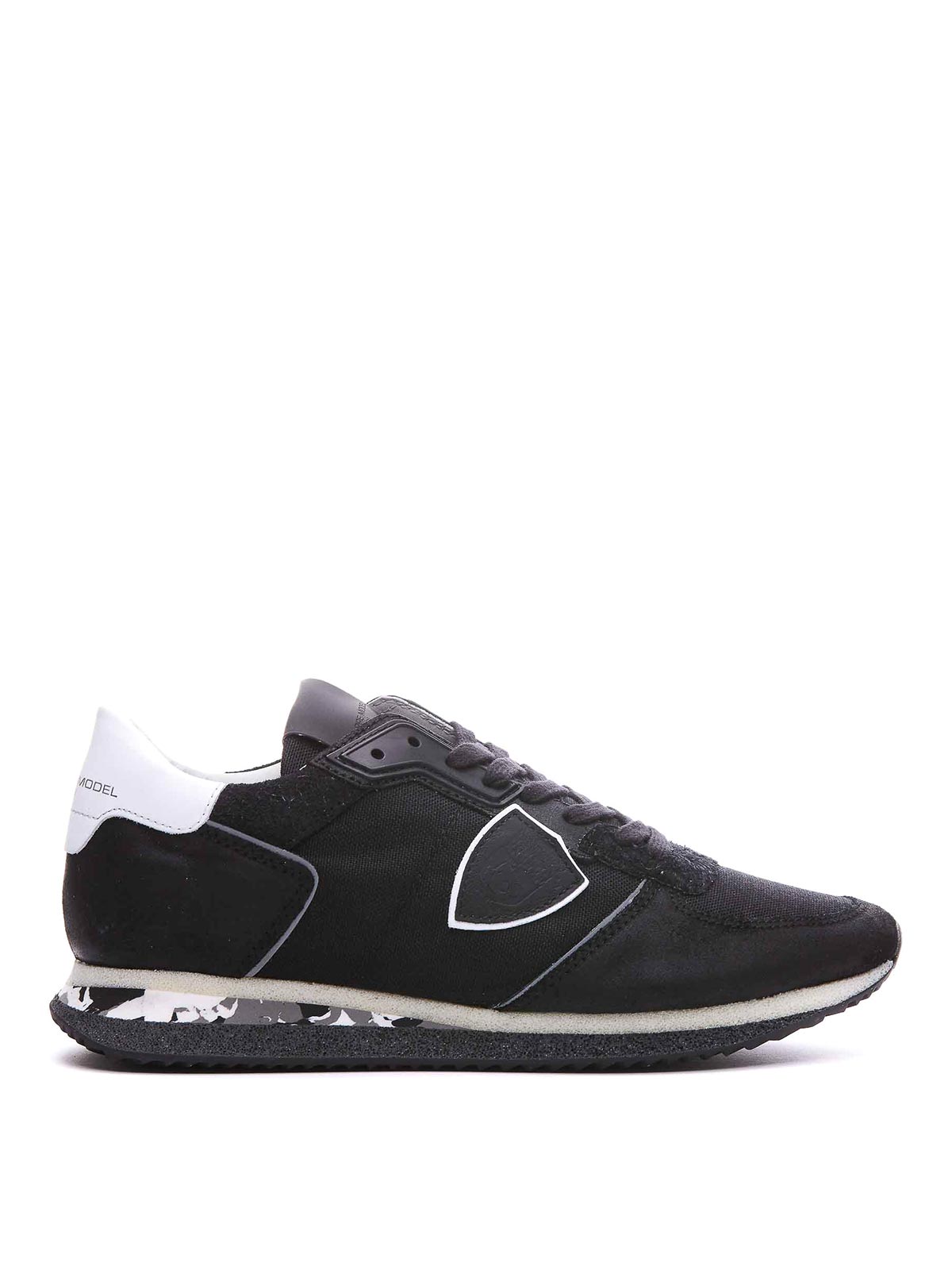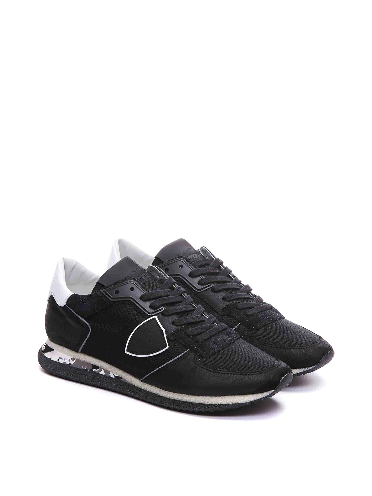 Philippe model black and white trpx sneakers round toe fabric and leather upper lace closure frontal lateral and back logo contrasting profiles