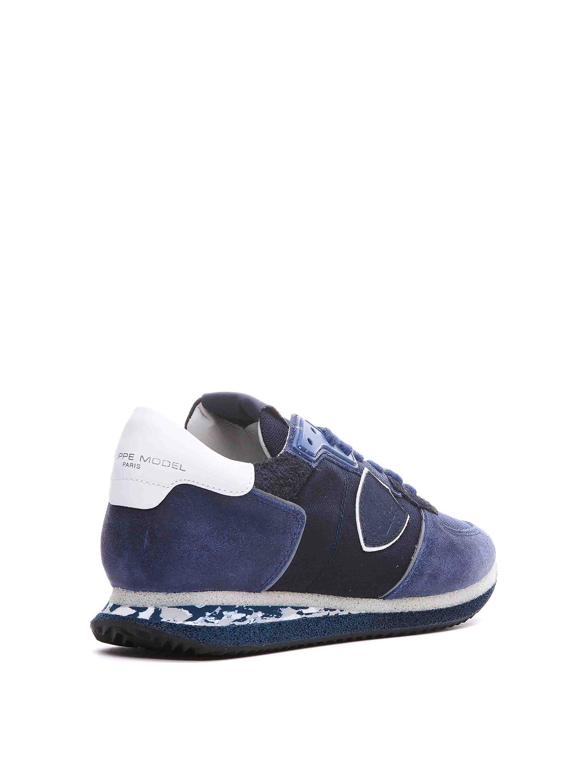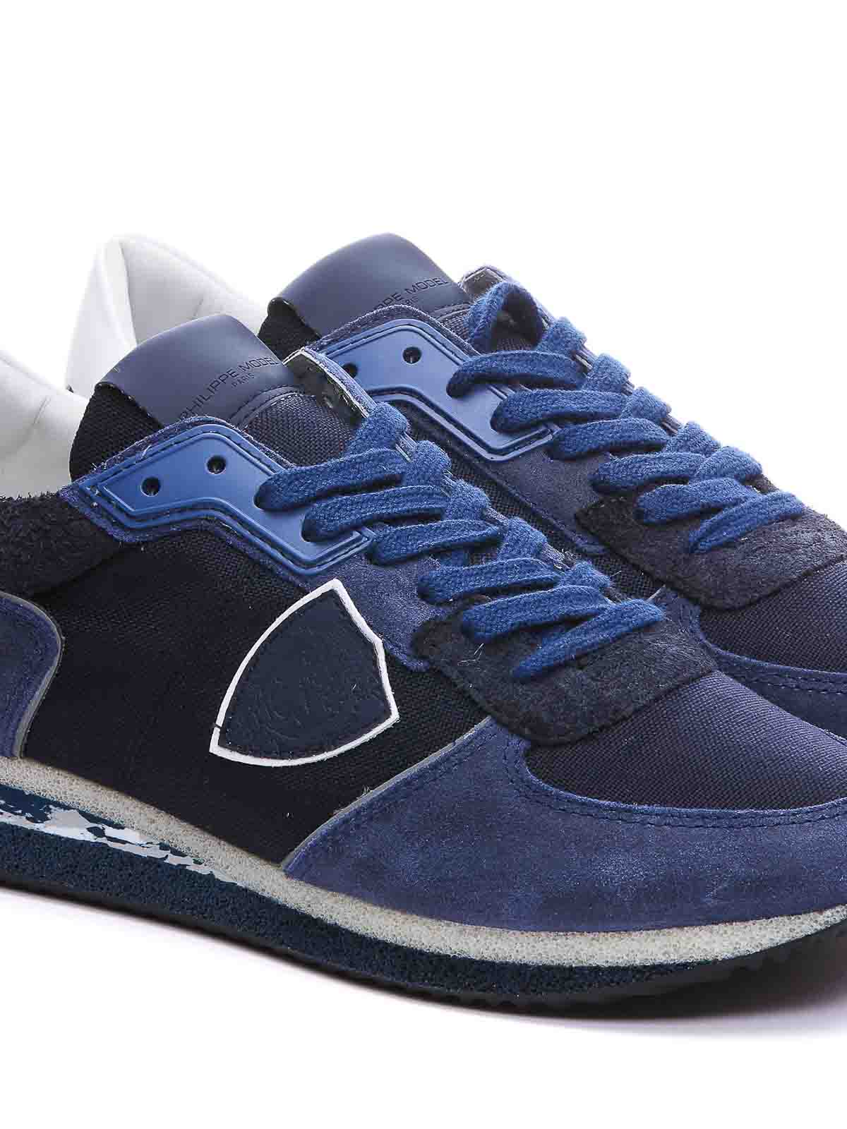Philippe model blue trpx sneakers round toe fabric and suede upper lace closure frontal lateral and back logo