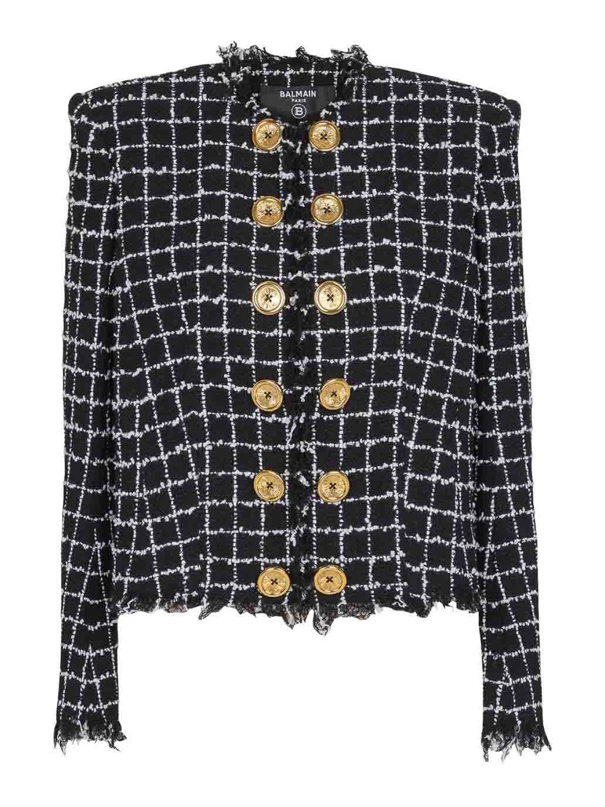 Black tweed texture frayed edges gold-tone buttons grid pattern long sleeves