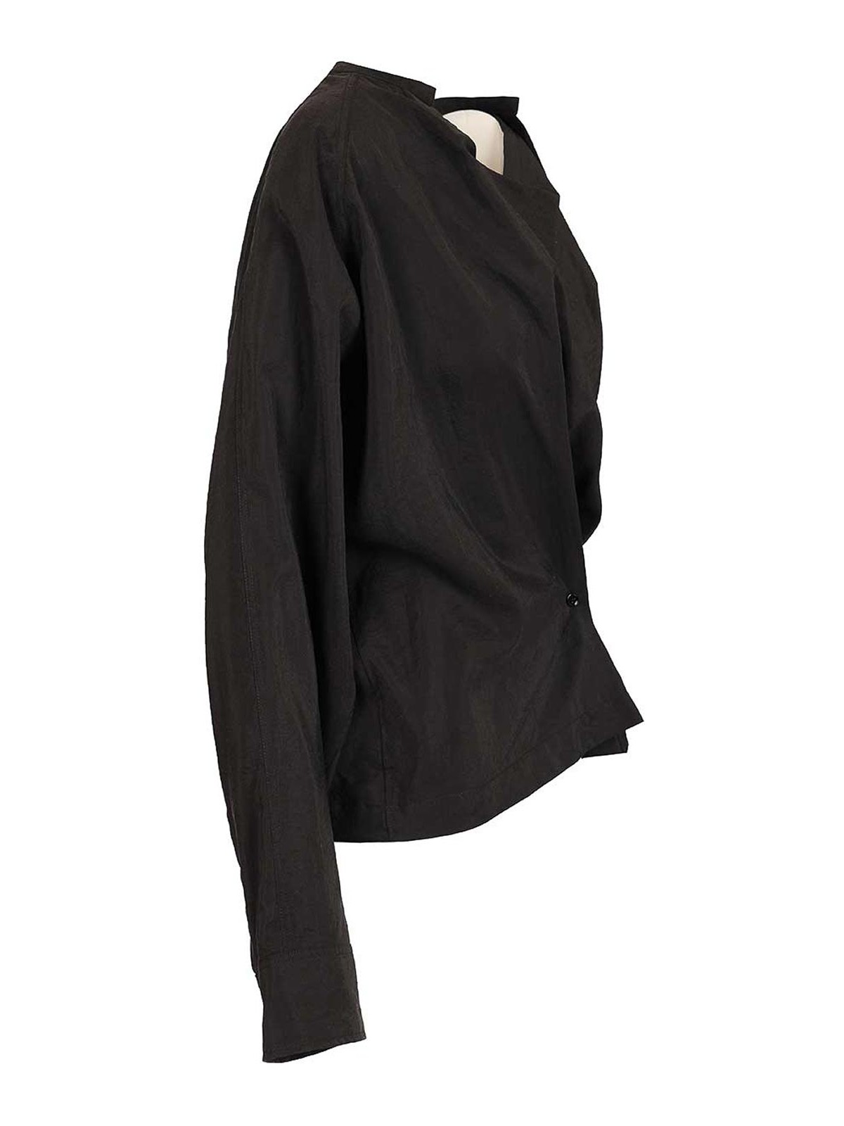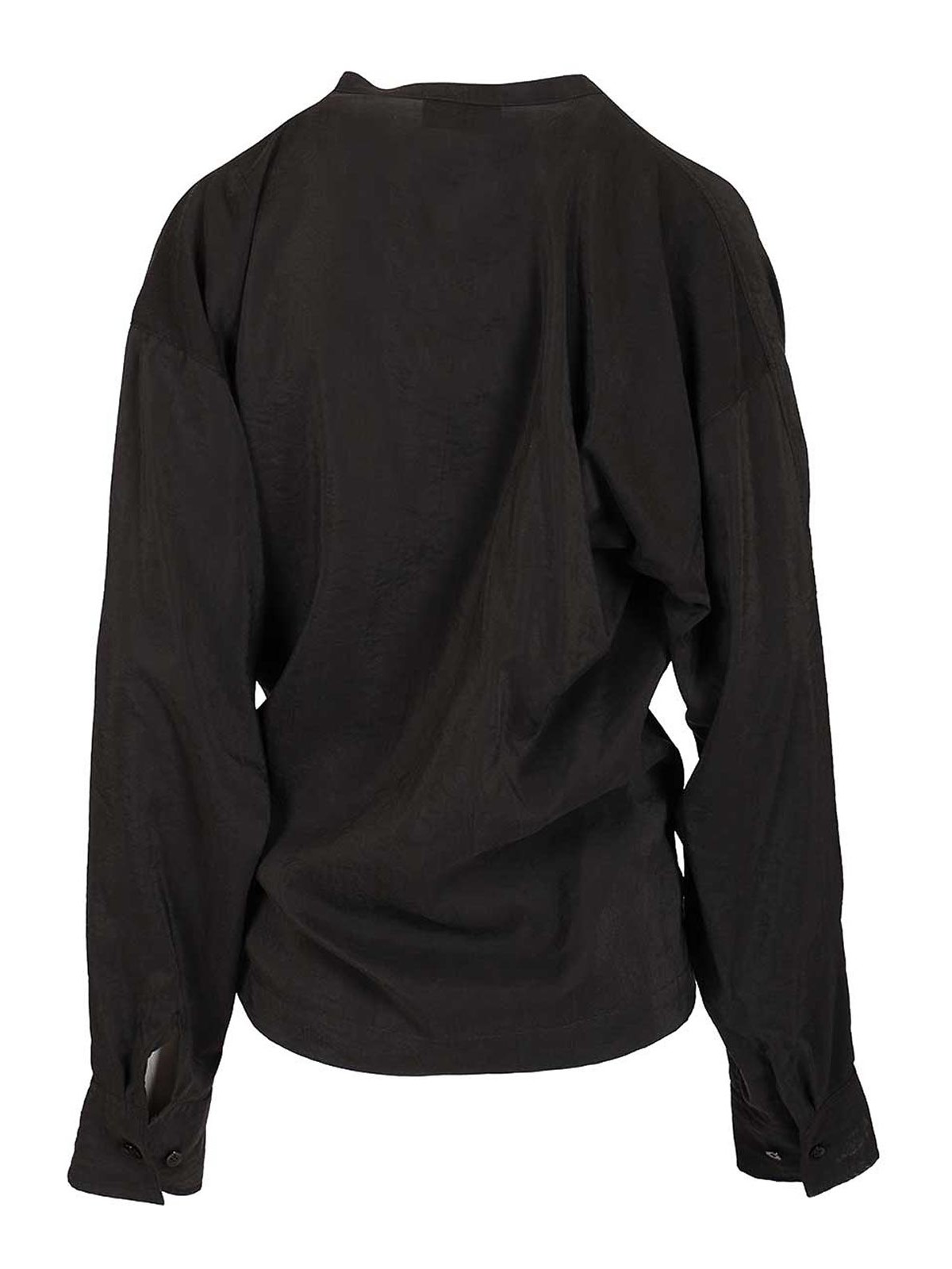 Twisted long-sleeved top made of silk blend with buttoned cuffs and lacquered button on the side