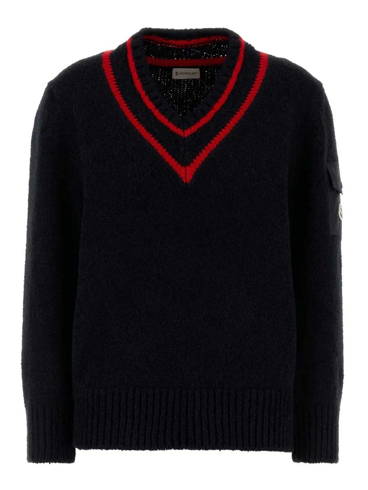 Black, v-neck, contrasting trim, patch pocket, ribbed hem