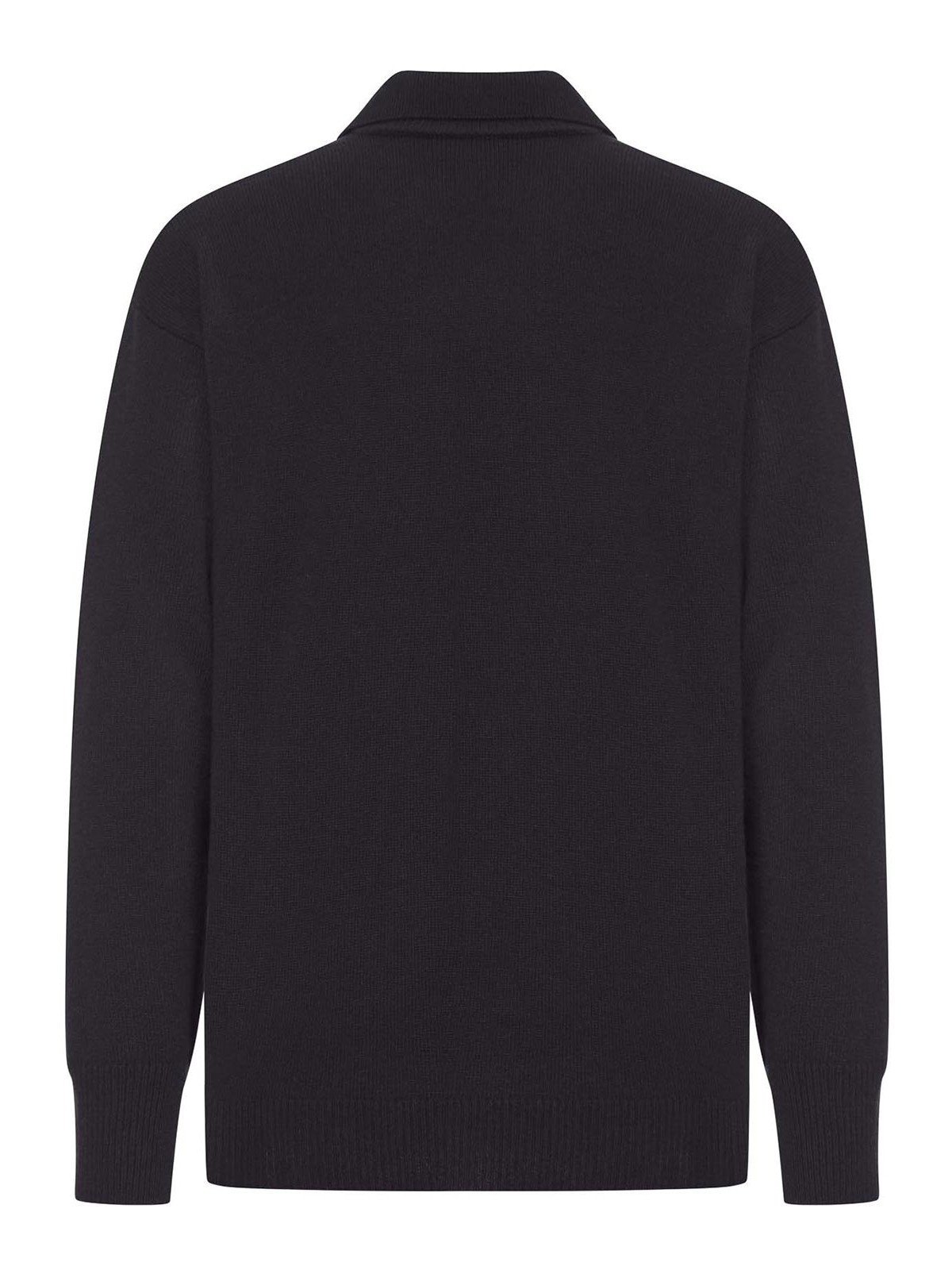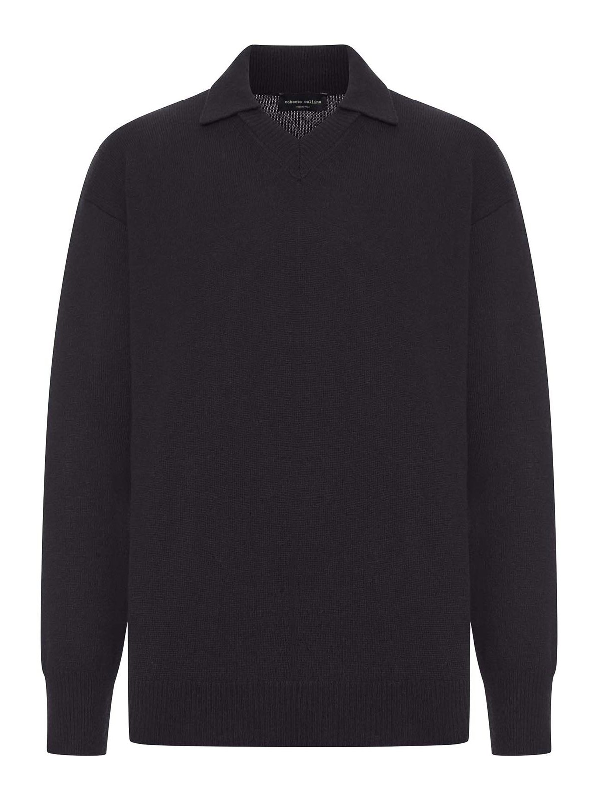 Classic collar- v-neck- dropped armholes- long sleeves- ribbed cuffs and hem- straight hem- color black