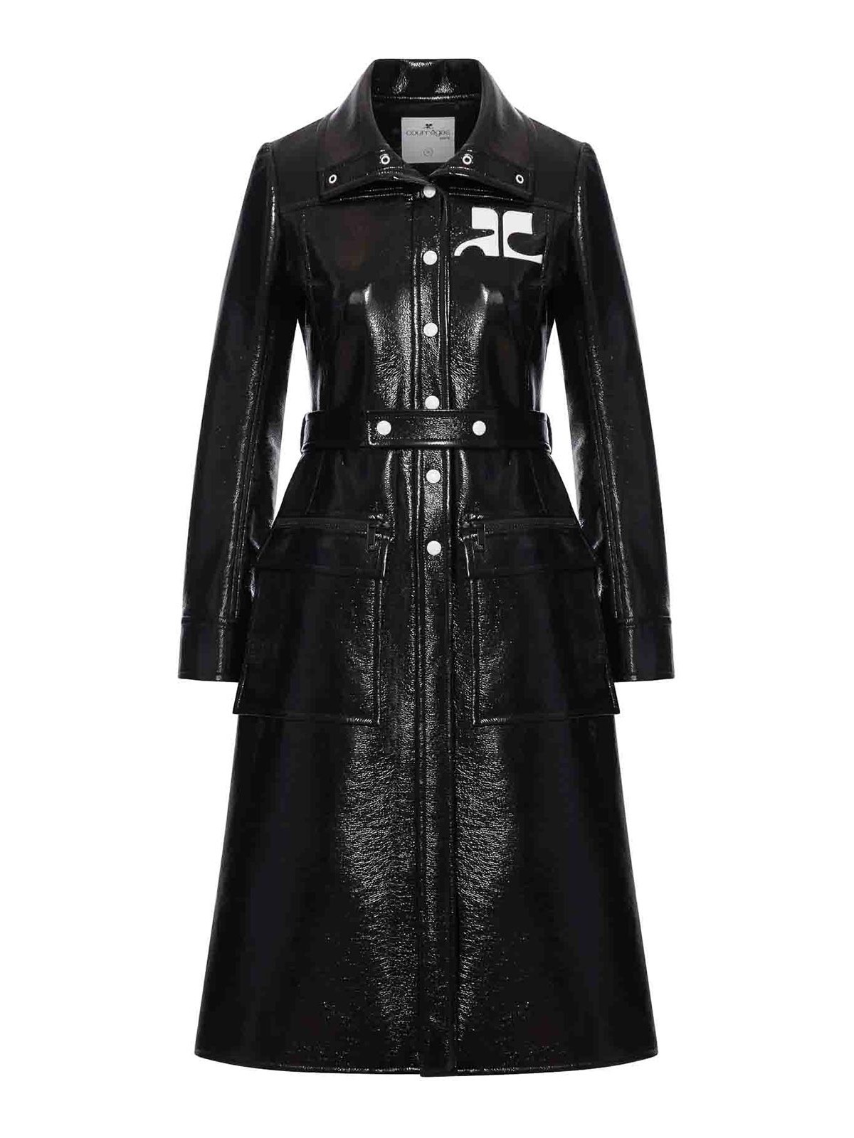 High collar, long sleeves, lined interior, white logo inlaid on the chest, removable belt with zip, applique pockets underneath, back slit, color black