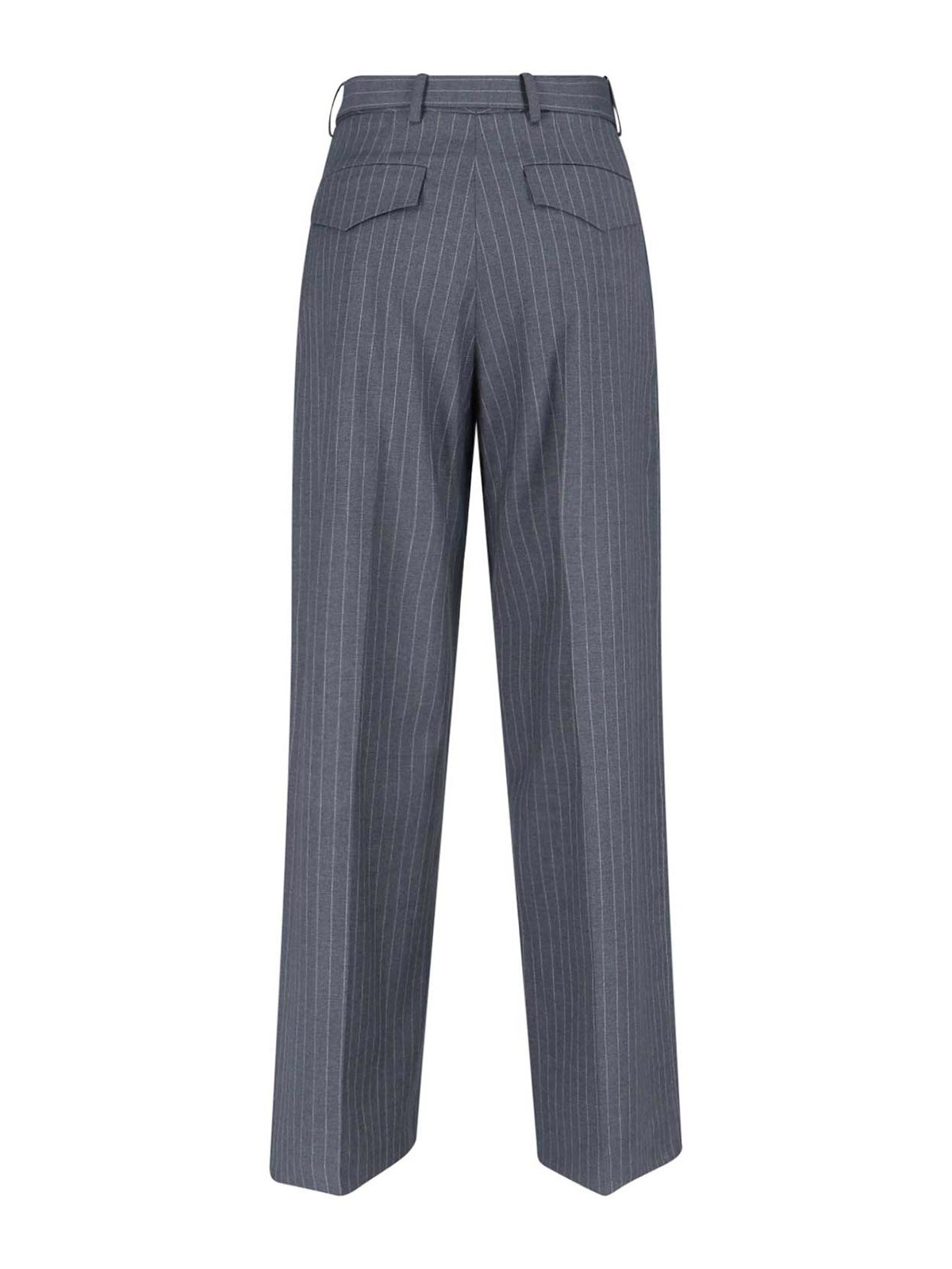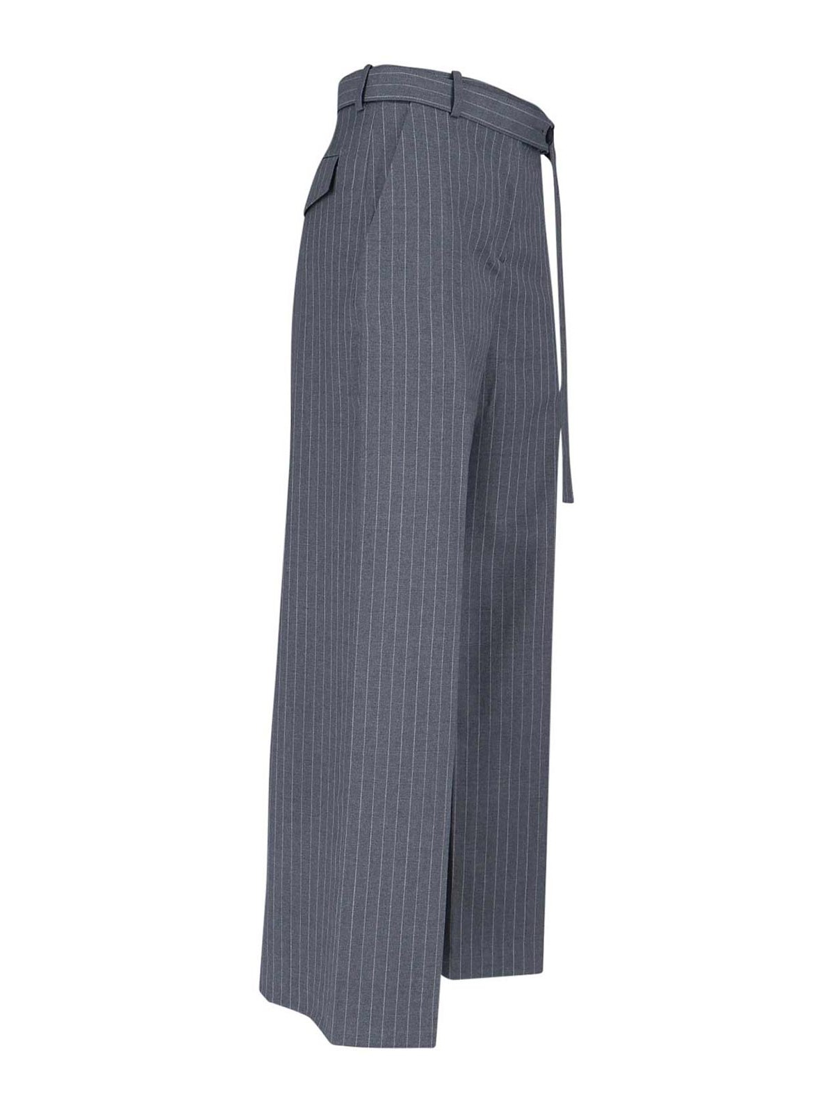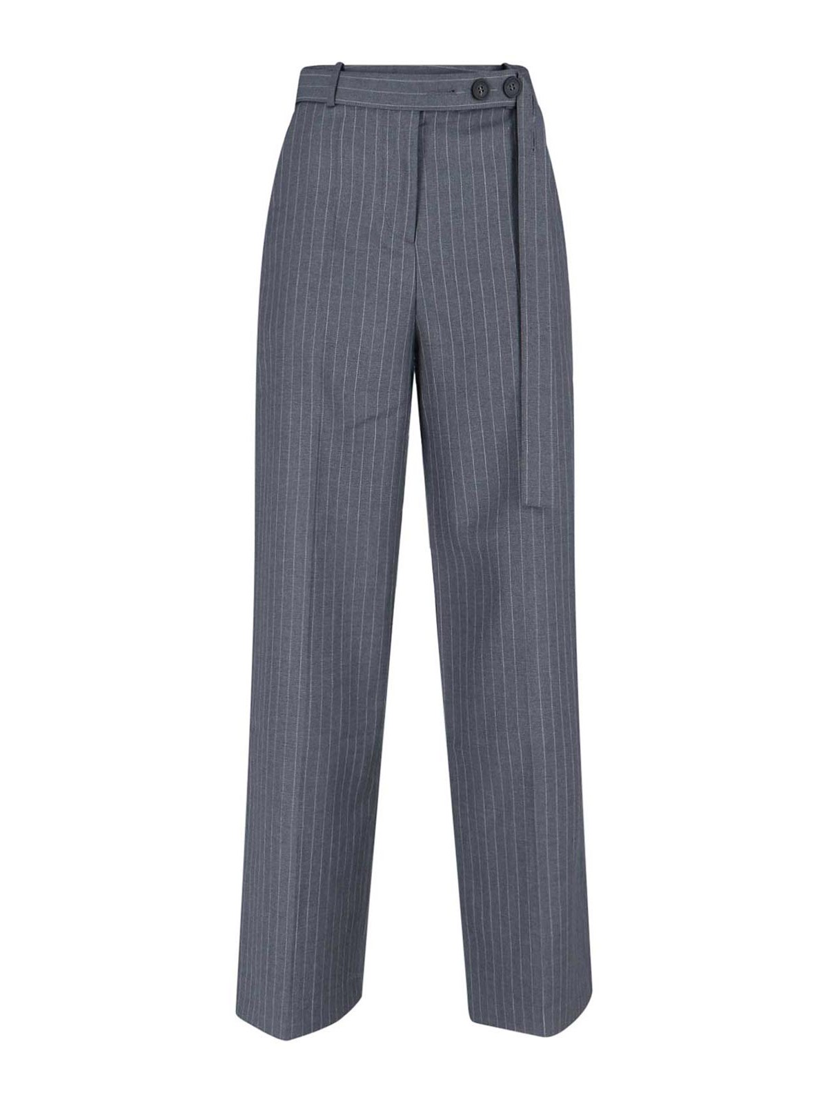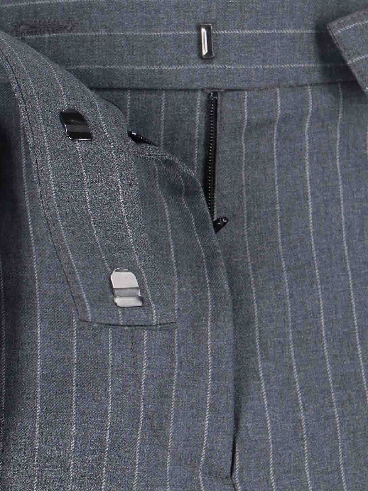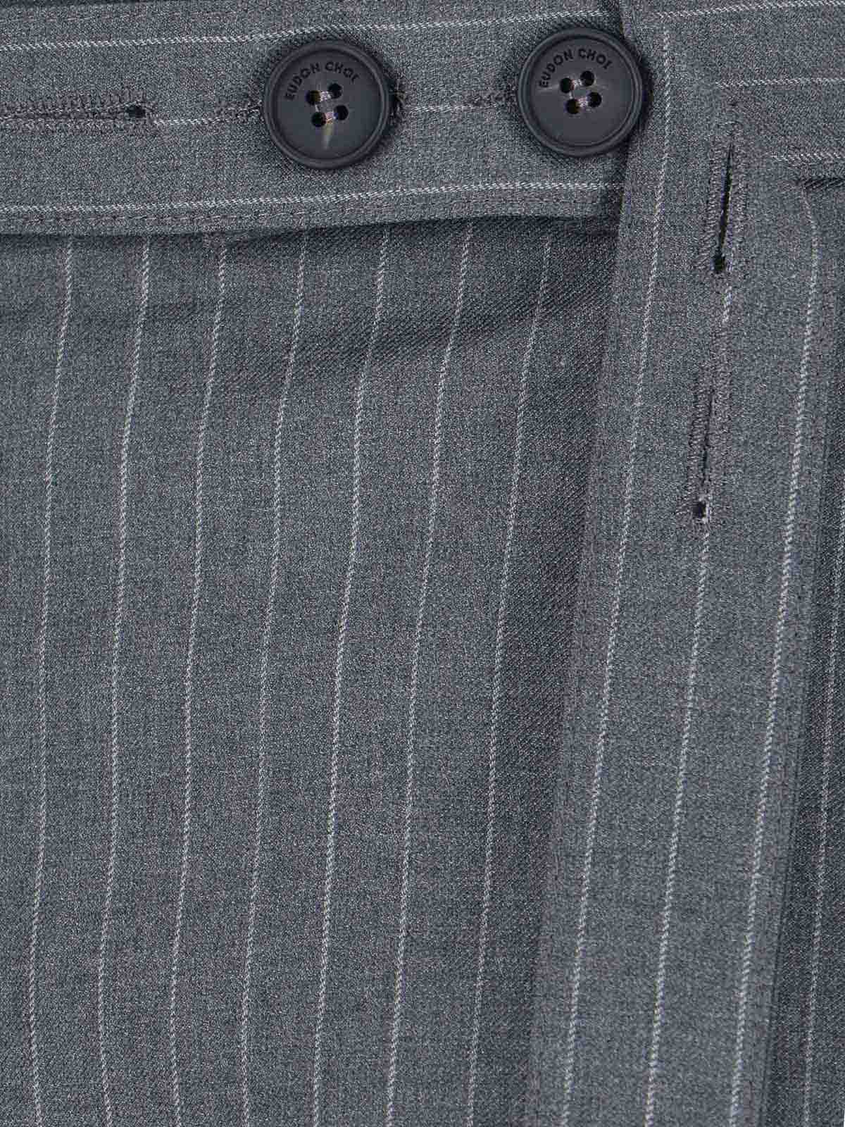 Eudon choi virgin wool trousers, verticig, pinstripe pattern, high waist, belt loops, adjustable and removable belt with buttons, hook and zip closure, two side pockets, two back pockets, straight leg.