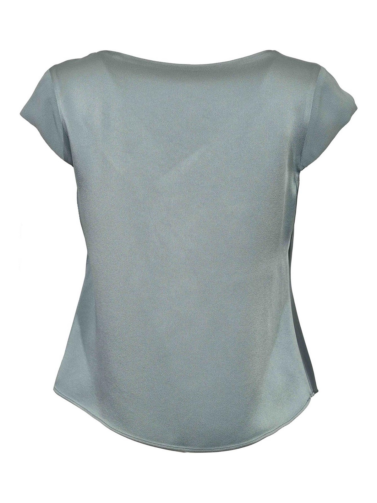 Viscose blouse herno light blue lightweight flowing pattern solid short cap sleeves neck soft crew neck slip, on style pockets none glossy finish slightly flared cut flowing with a silky feel logo at the hem lined no fit regular