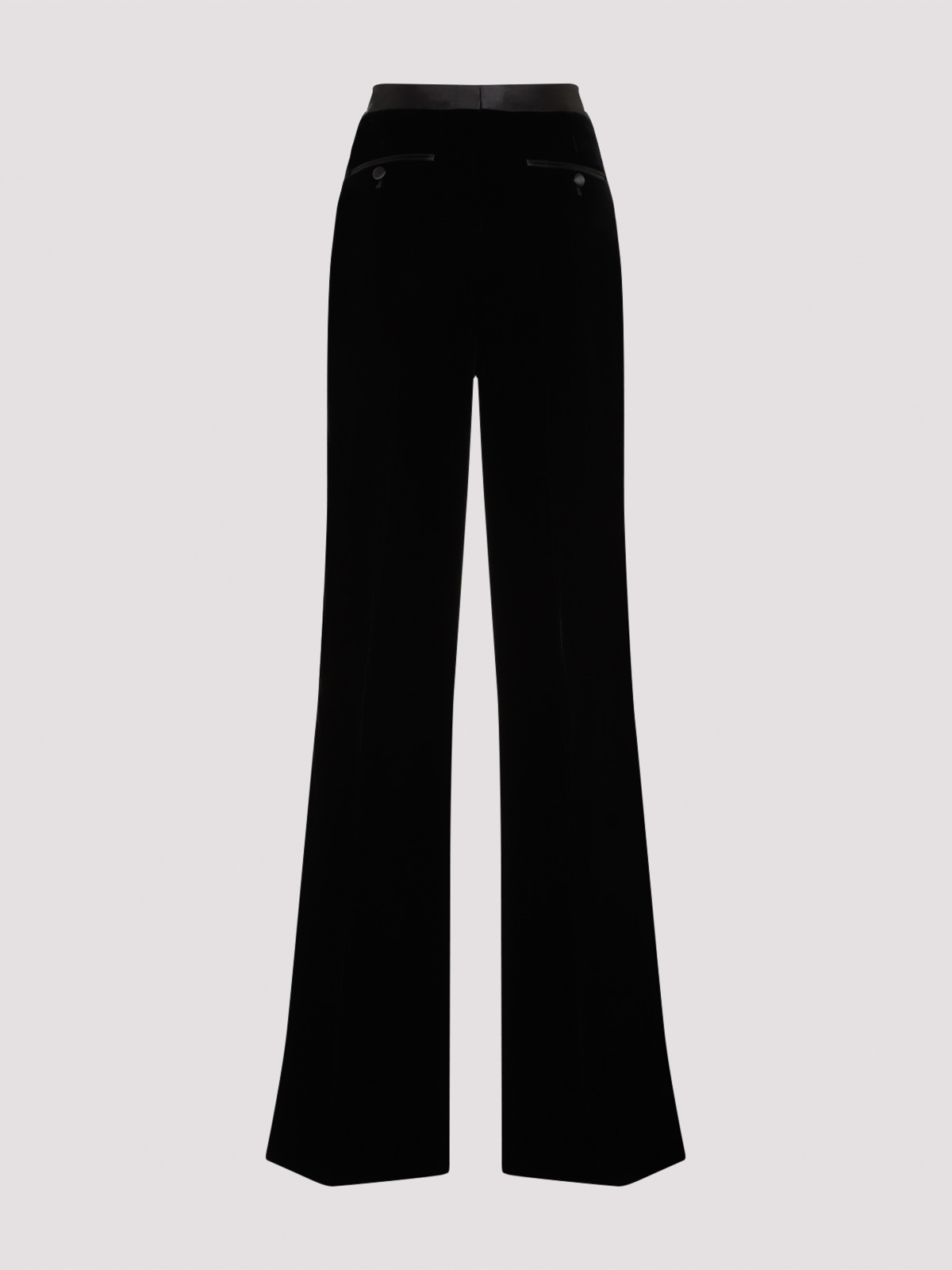 Tom ford black viscose velvet boot cut pants. crafted in viscose and cupro. front concealing zipped and hooked fastening, side pockets, back slit buttoned pockets, flared leg, boot cut design, side tonal band, straight hem.