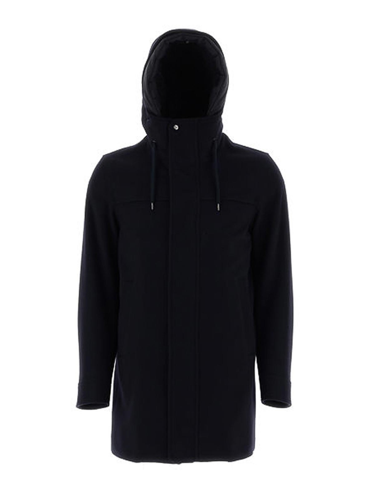 Herno parka made of layered material coupled with an additional waterproofing process the texture has a snappy and dry feel that resists pilling and wear regular fit in down fixed hood with drawstring covered with zip and snap welt pockets