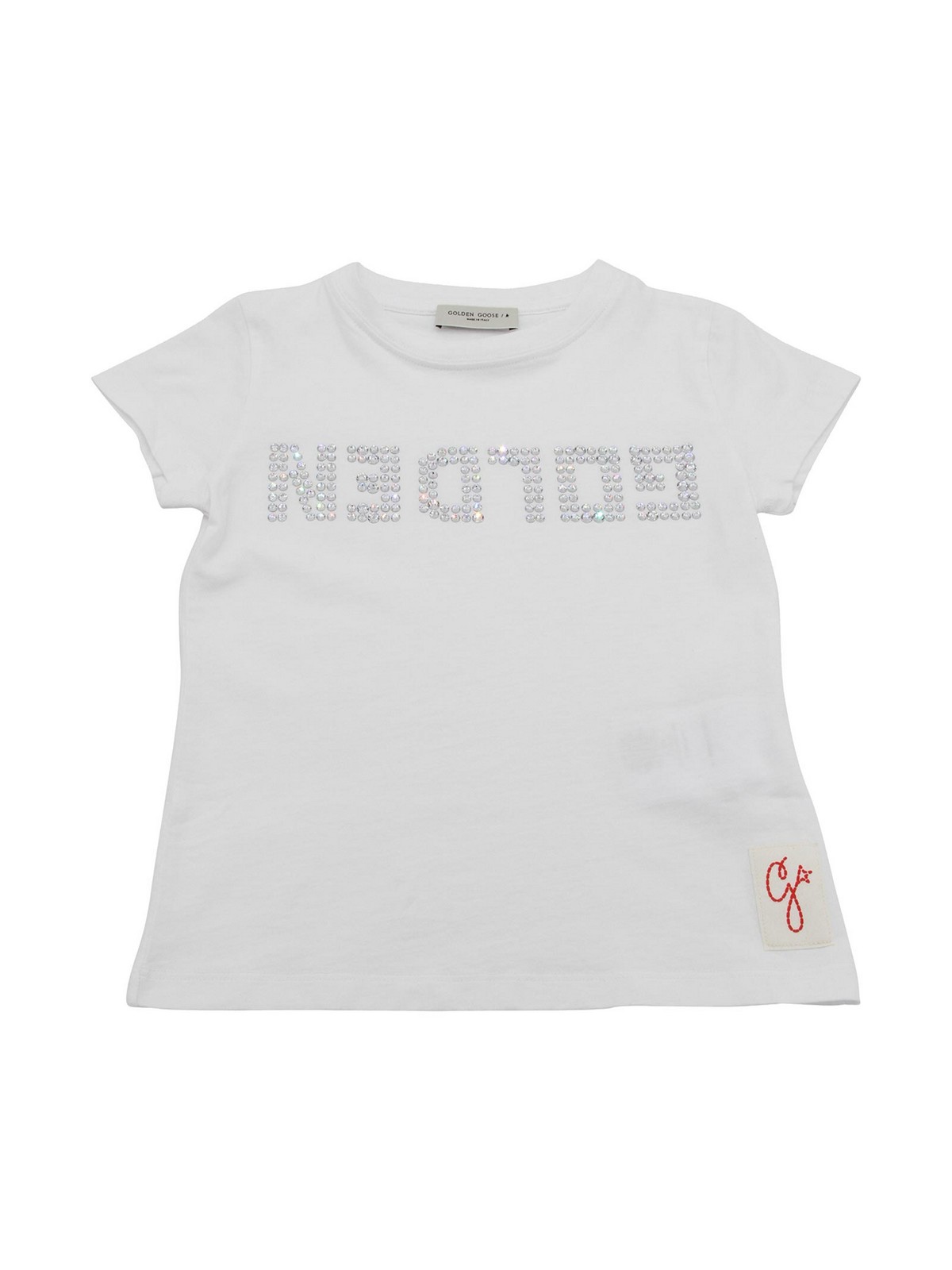 White golden T-shirt from golden goose kids featuring short sleeves round neck and golden rhinestones application at