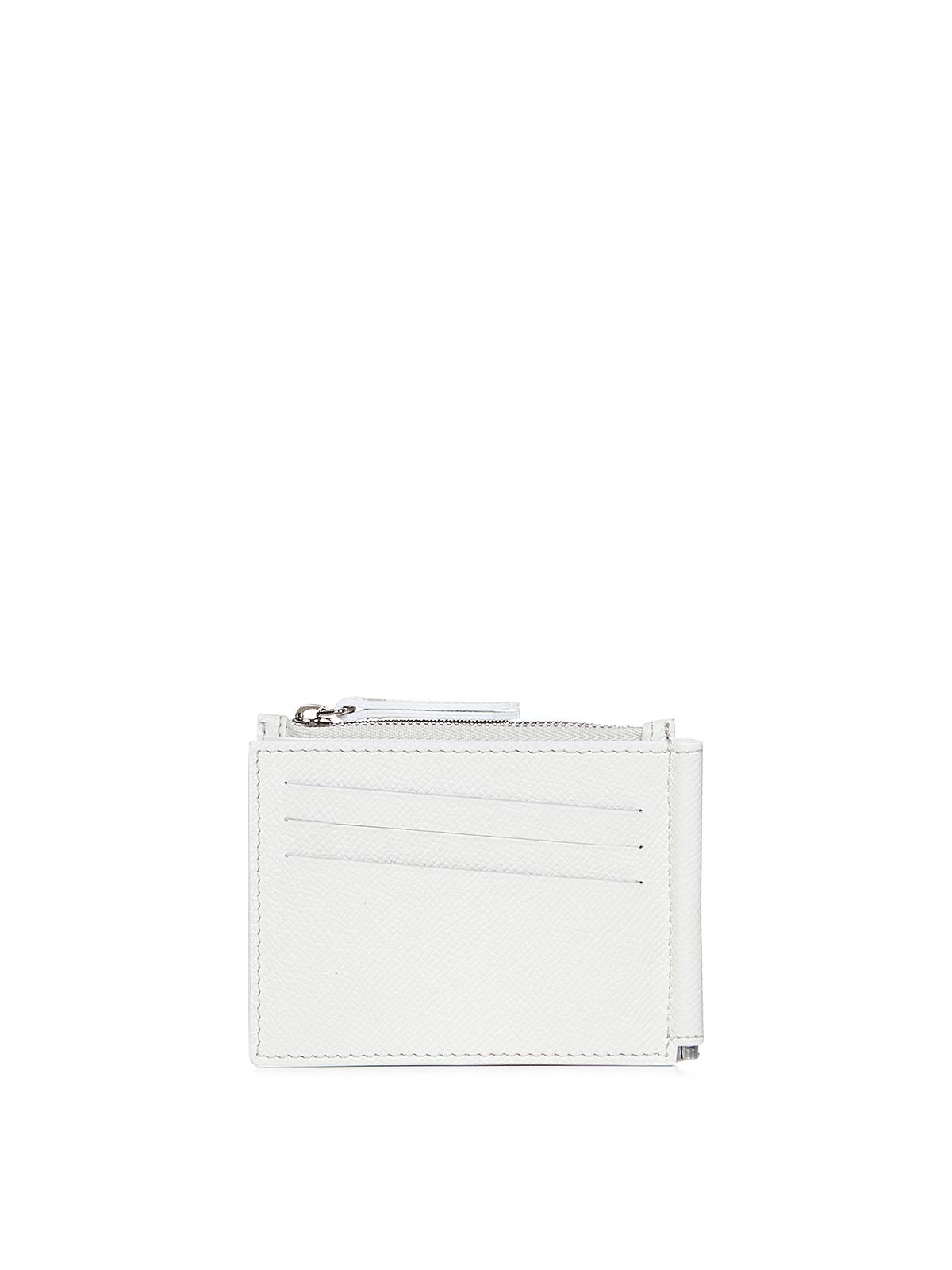 Bifold design signature four white stitching at back silver logo embossed inside inside in smooth leather with silver metal money clip exterior three front credit card slots zipped compartment silver-toned metal hardware height length depth white cow leather inside 100% bovine leather lining 100% viscose metal parts 100% brass - 100% zinc