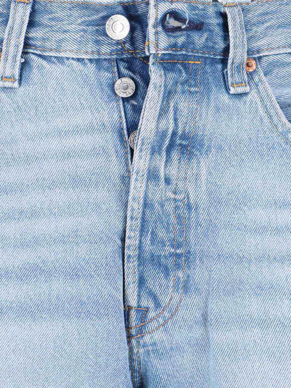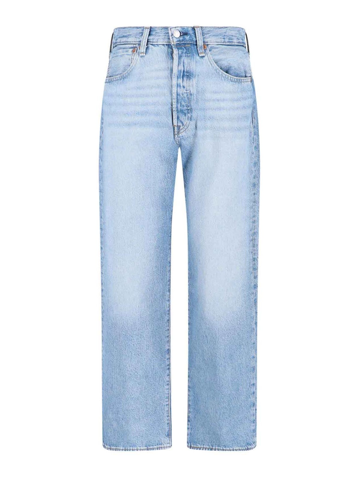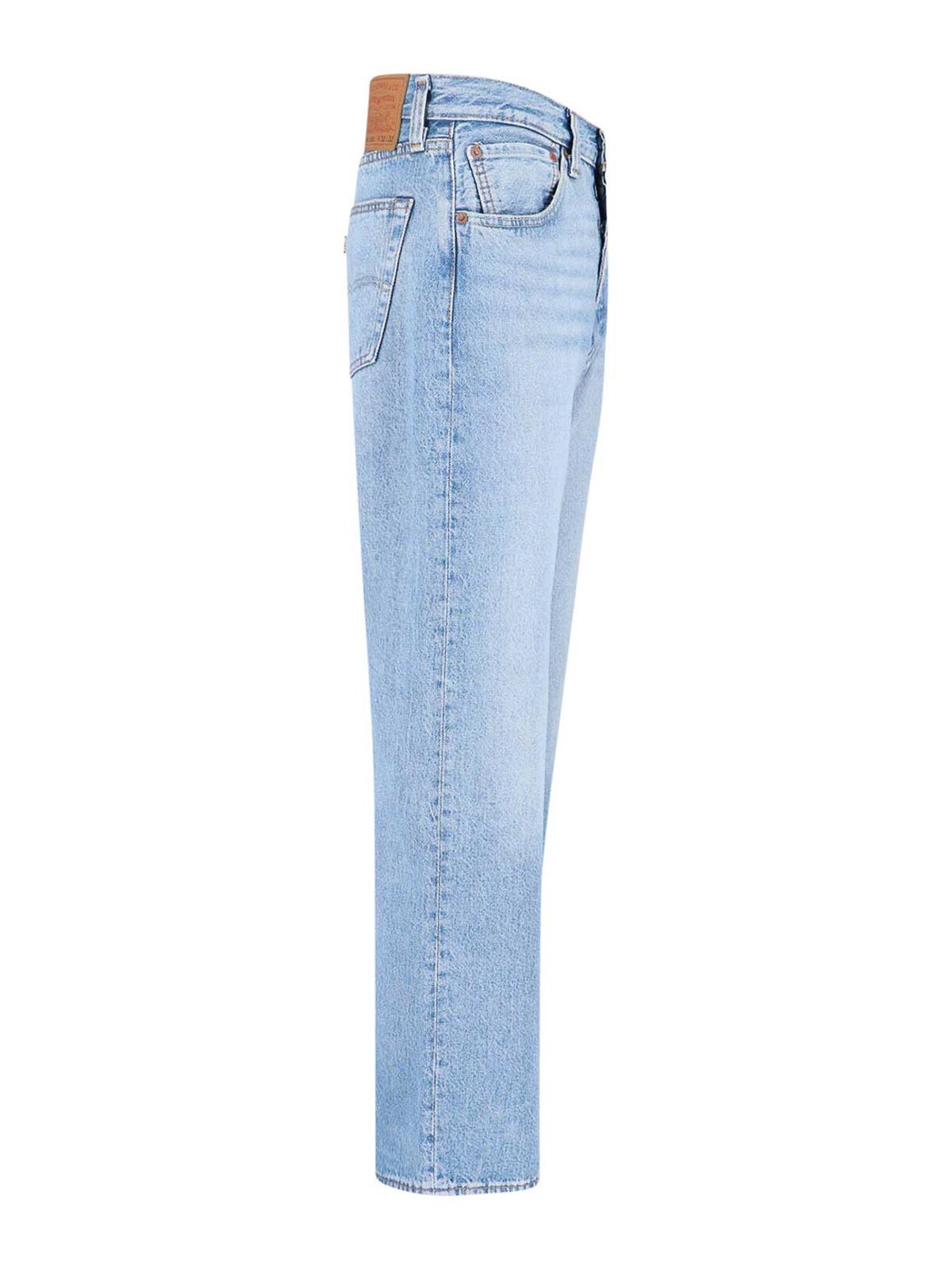 Levi's Strauss loose wide jeans in light blue cotton denim, medium waist, button closure, five pocket design, belt loops, rear logo patch, contrasting rear logo tag, straight leg.