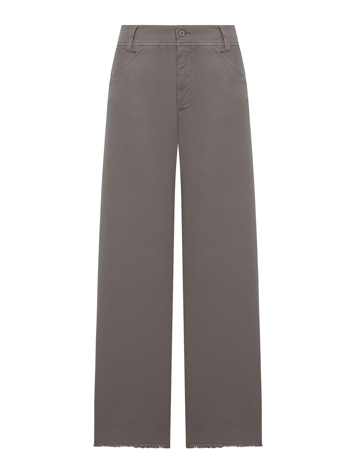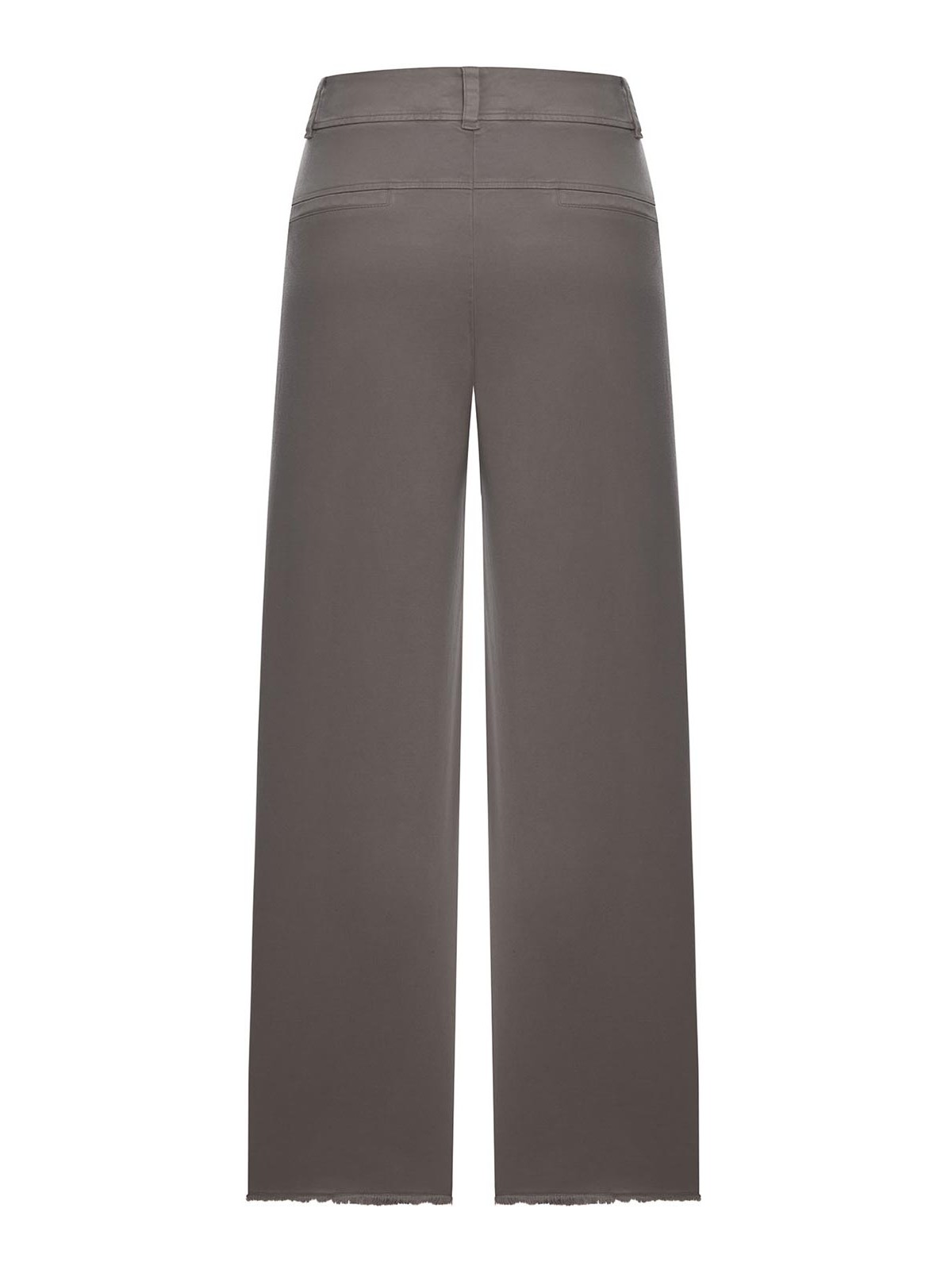 Satin trousers, belt loops, zip and button, velvety feel, slightly open at the bottom, slant pockets, two back welt pockets, raw hem, garment dyed, color grey