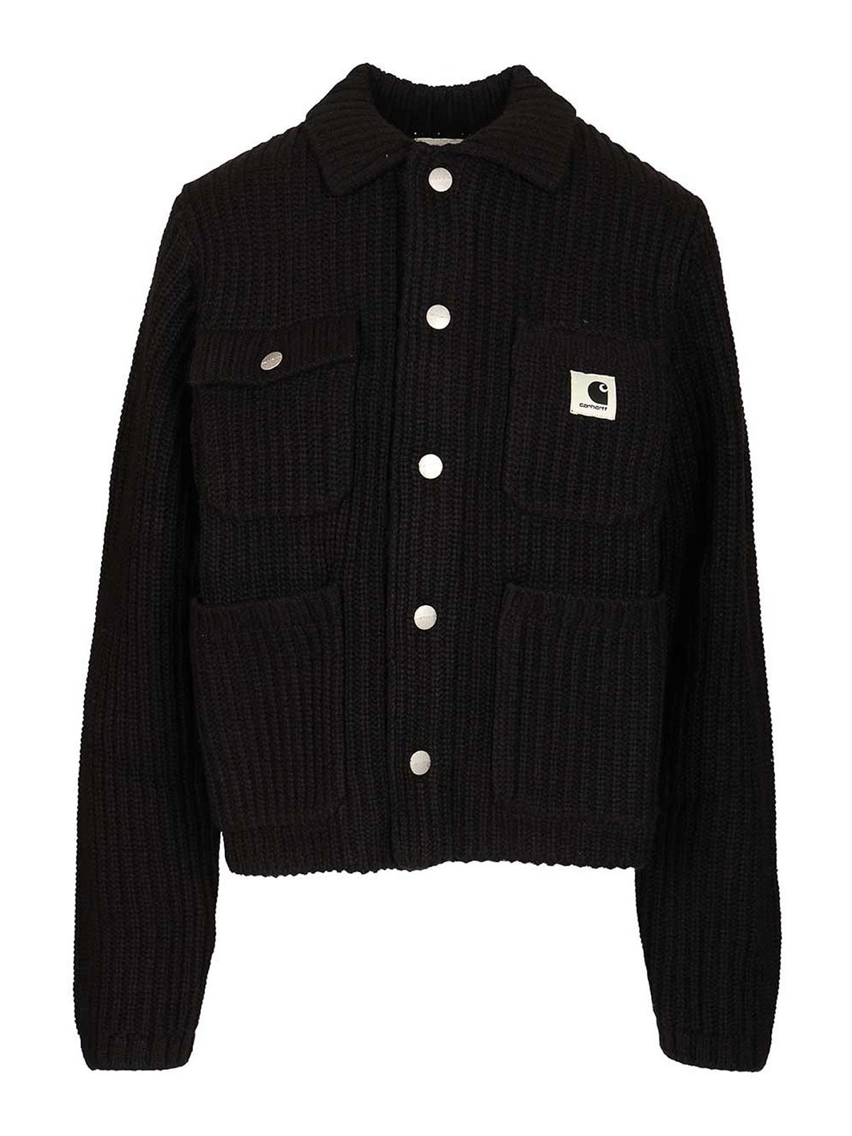 women's michigan cardigan in a blend of and yarn by carhartt wip with four patch pockets on the flap and button and a square woven label on the chest