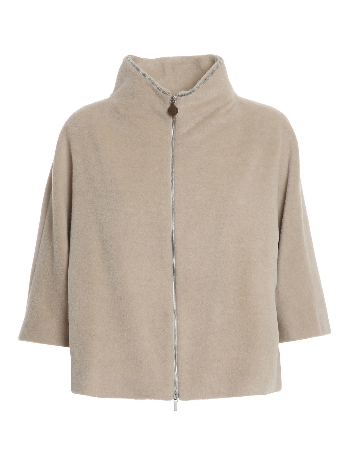 Wool blend cropped jacket featuring sparkling rhinestone embellishment, half sleeves and zip closure.