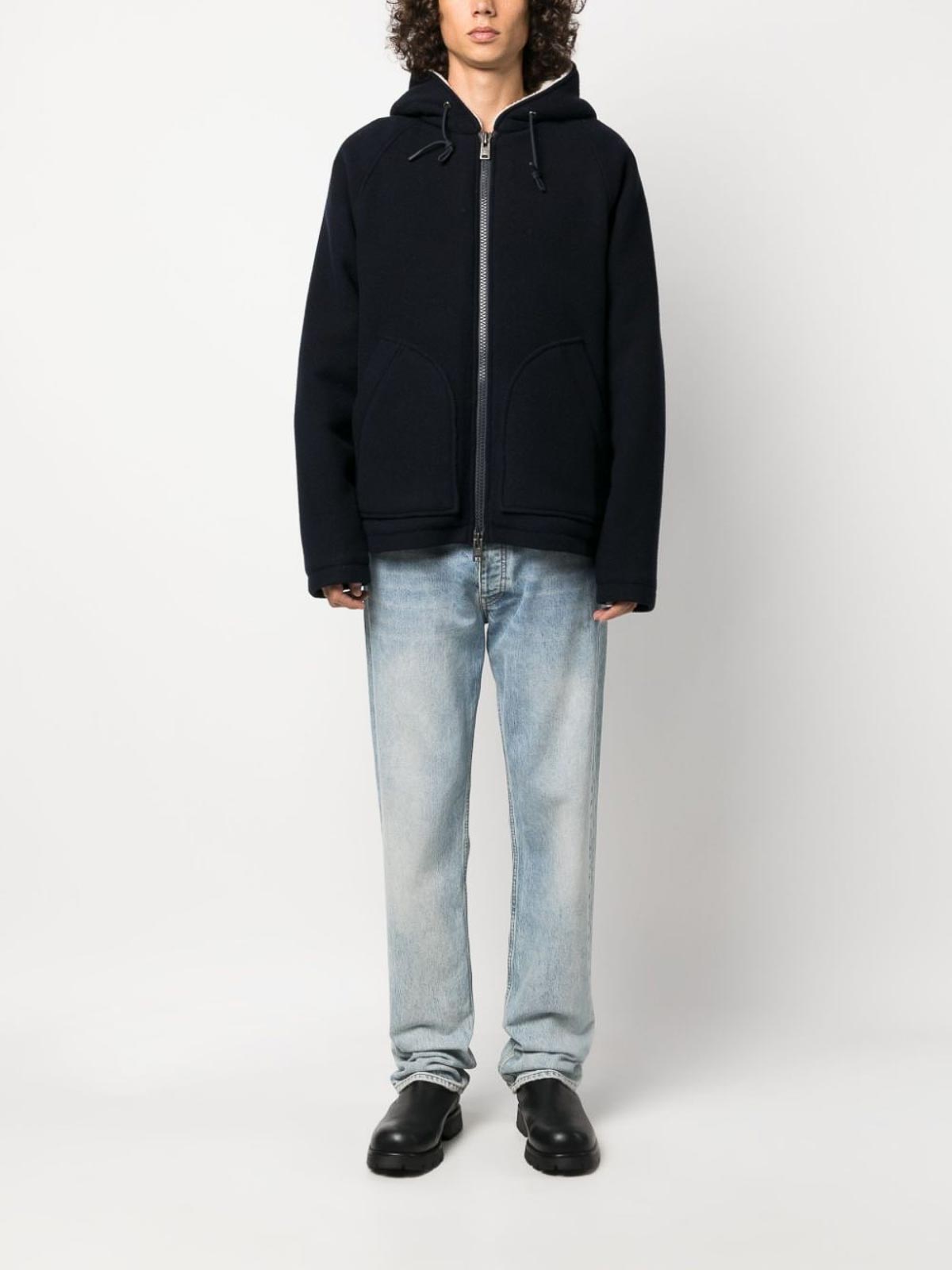 Drawstring wool-blend hooded jacket from woolrich featuring navy blue blend drawstring hood zip long sleeves two side slit pockets and straight hem