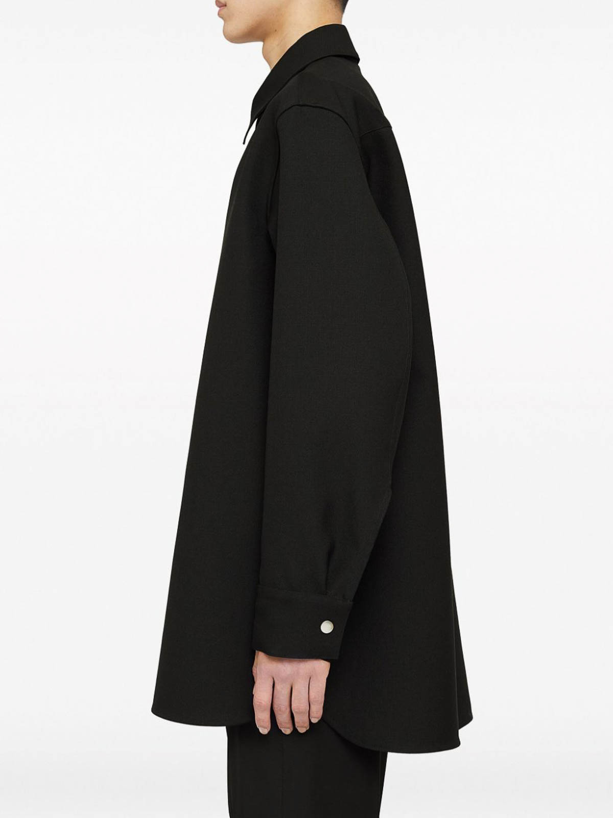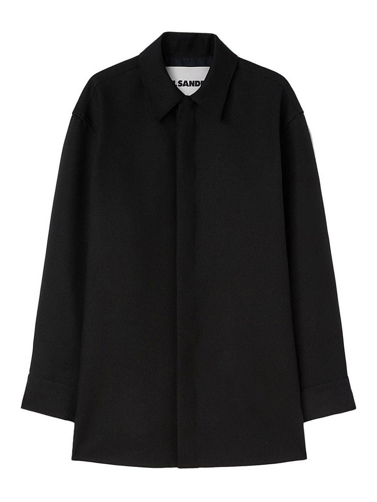 Wool shirt jacket from jil sander featuring black classic collar concealed shoulder long sleeves and press-stud cuffs