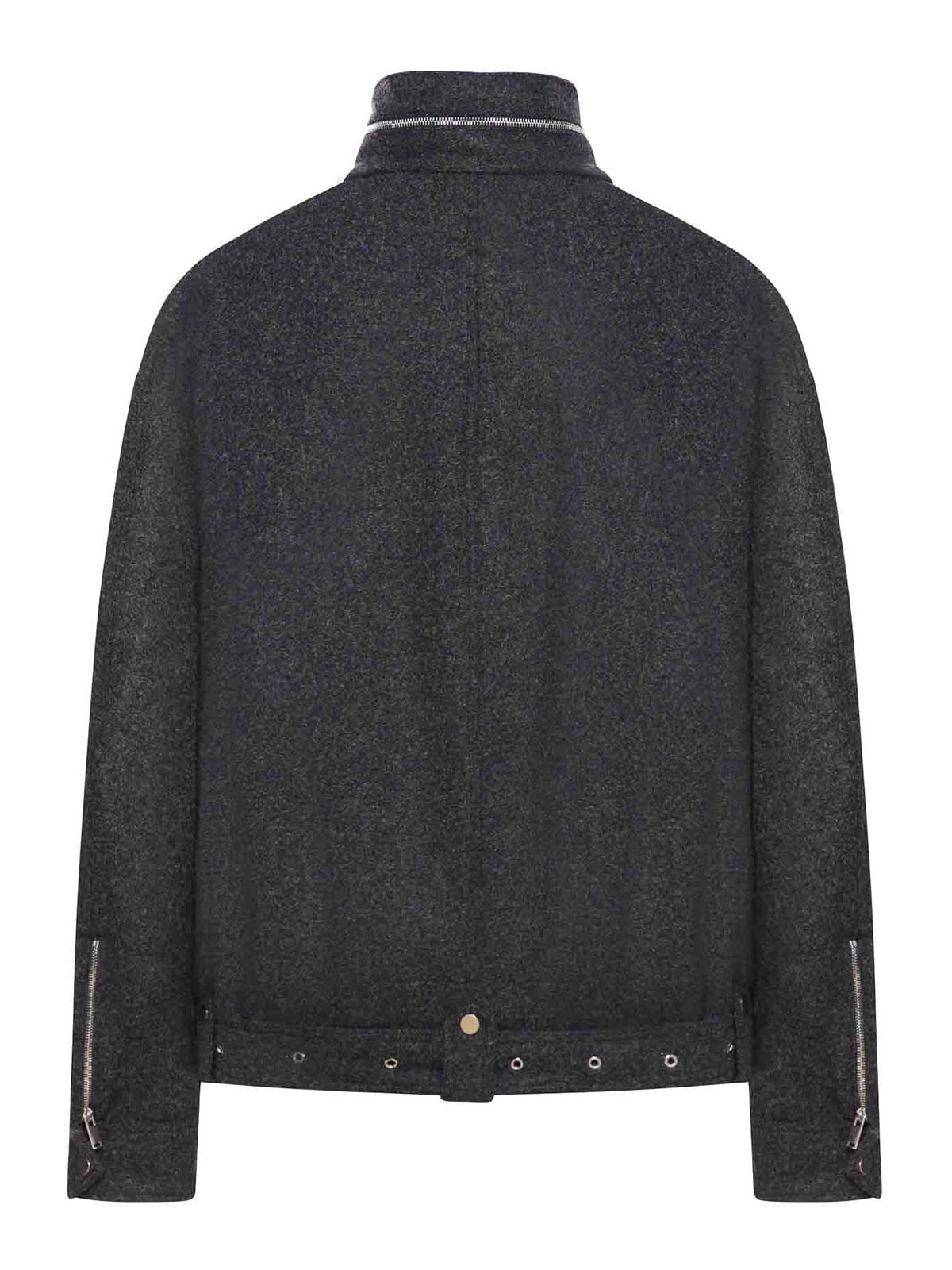 High collar with zip, placket with snap buttons, three patch pockets with flaps and snap buttons on the, adjustable waist belt, straight hem with belt loops, adjustable cuffs with button and zip, - color grey