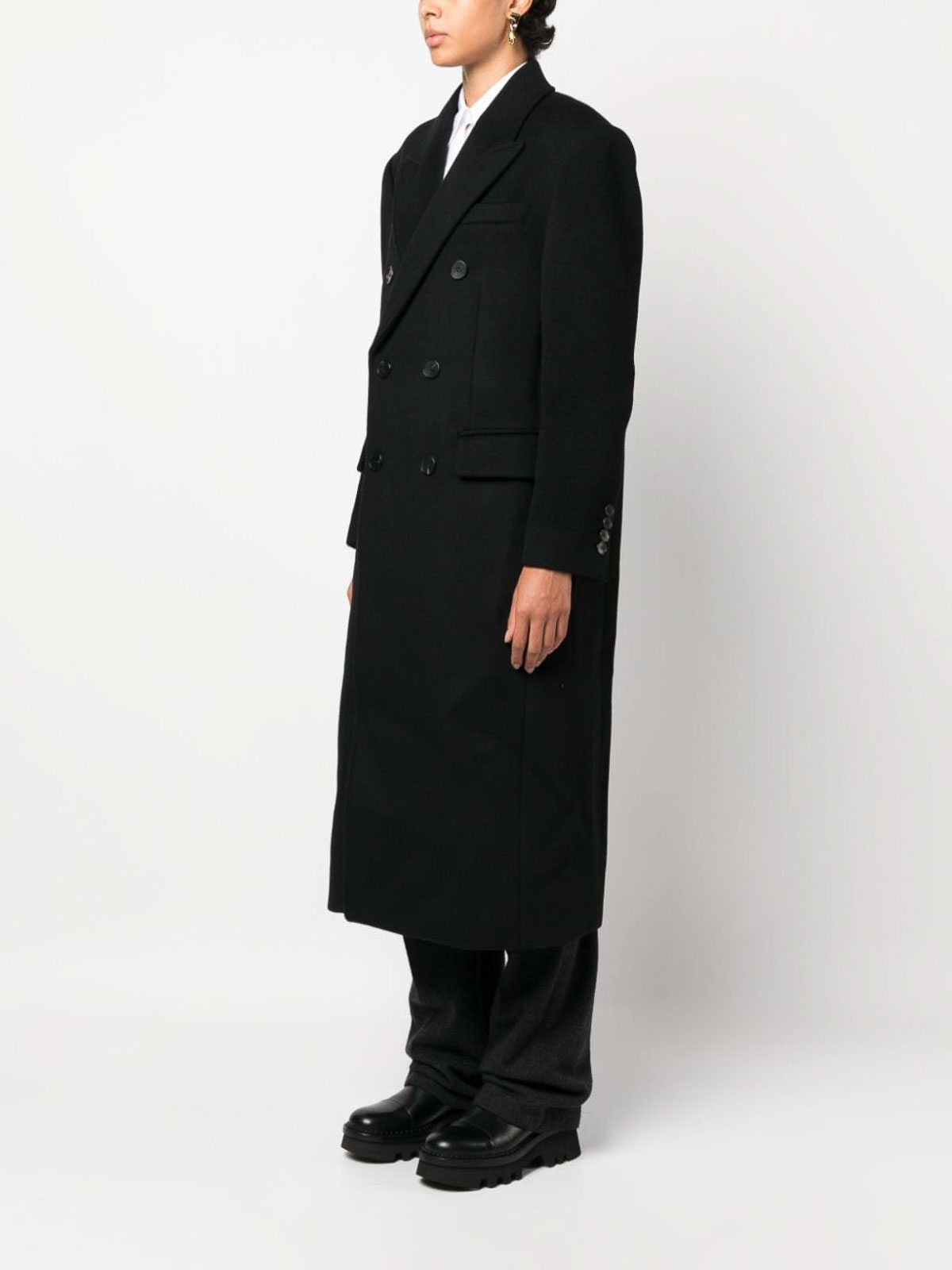 Wool felted double-breasted coat from dunst featuring black felted finish peak lapels double-breasted button two flap pockets shoulder pads long sleeves buttoned-cuff sleeves mid-length central rear vent and straight hem