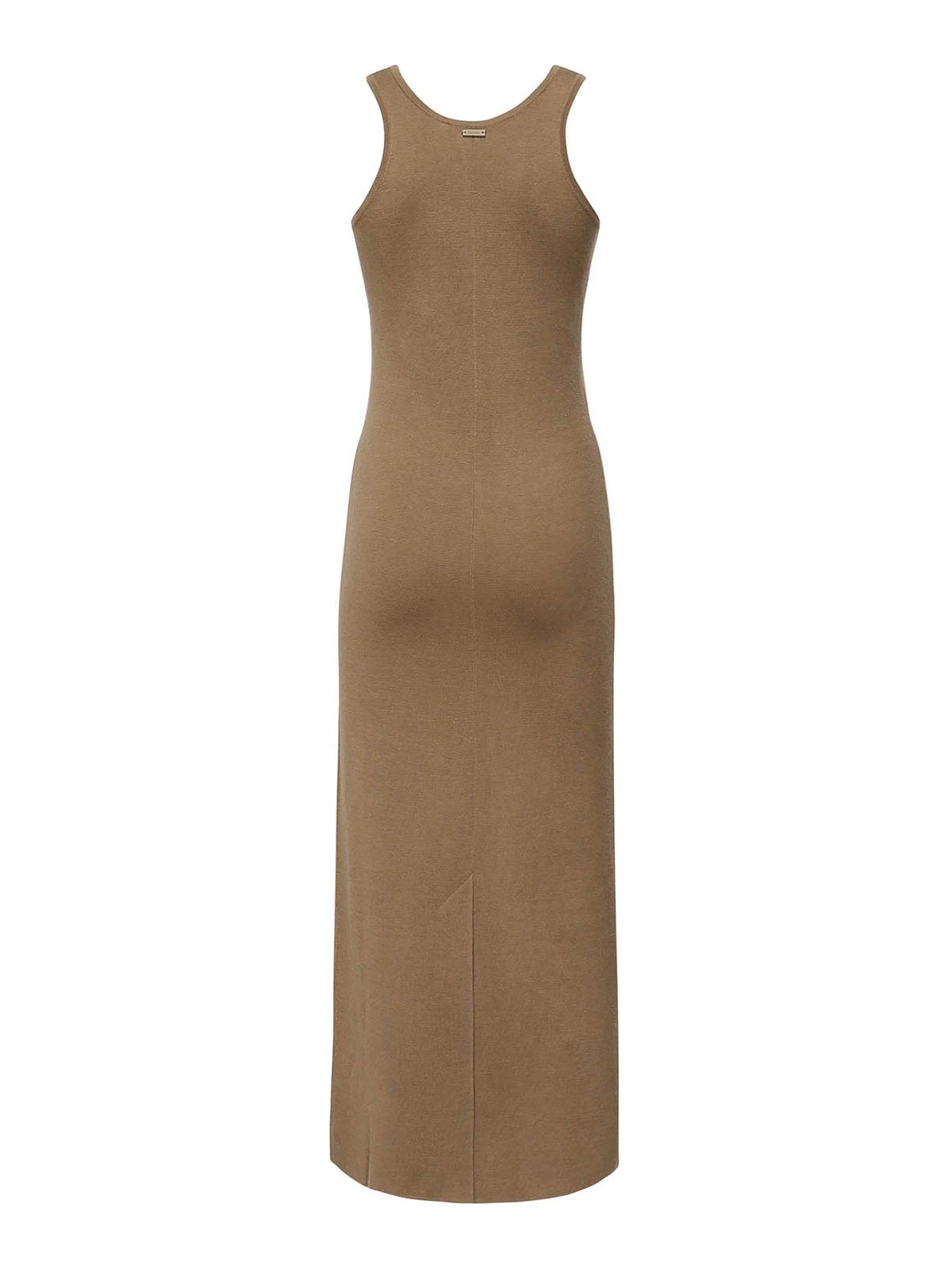 made from fine pure wool yarn, sleeveless, halterneck, center back vent, slim fit, size shown in photo is s, made in italy, color: hazelnut