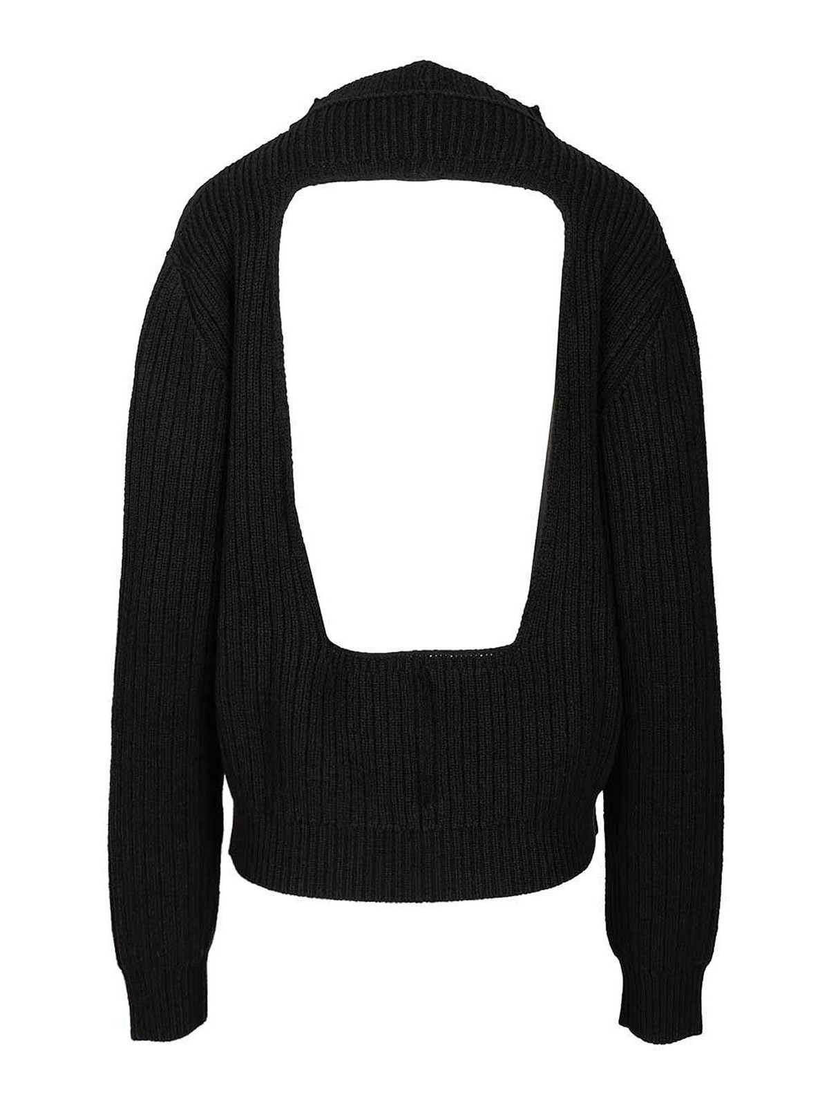 Rick owens ribbed wool sweater featuring a rounded shape, ribbed crew neck with a v-cut cut, ribbed cuffs and hem, and a cut-out detail at the back.