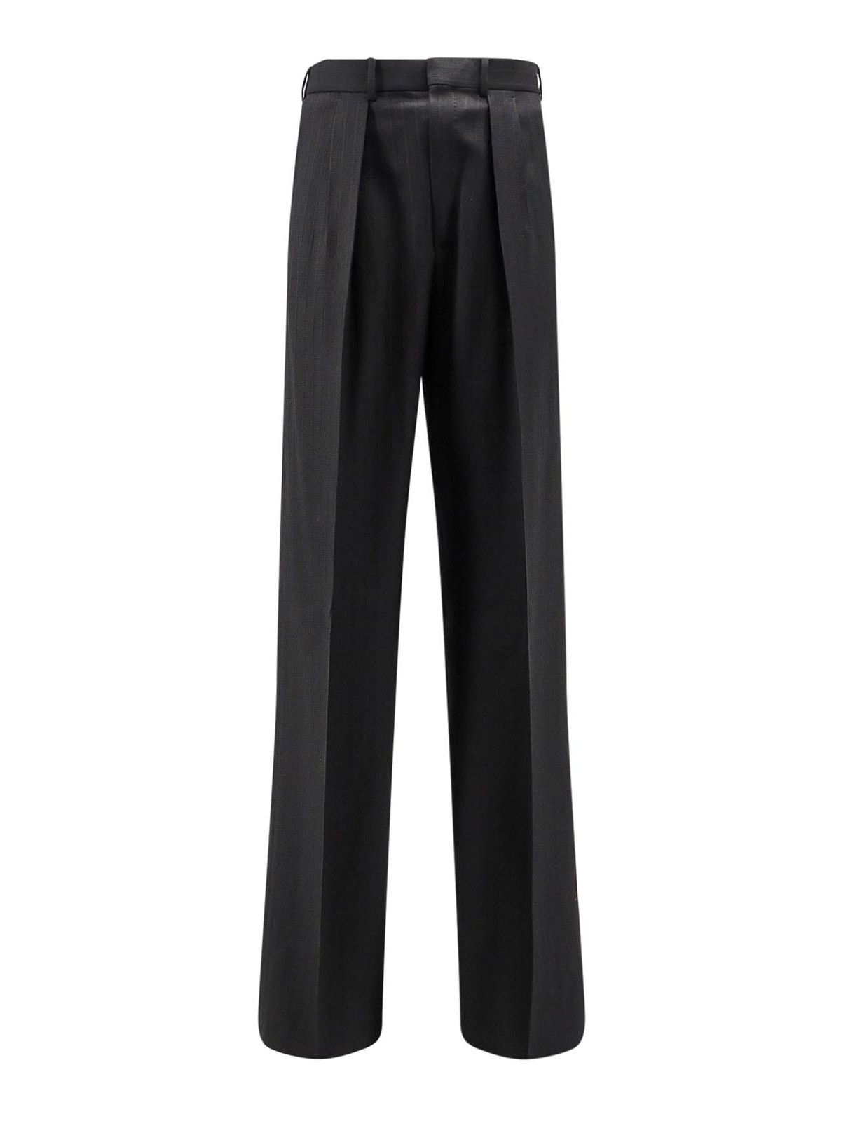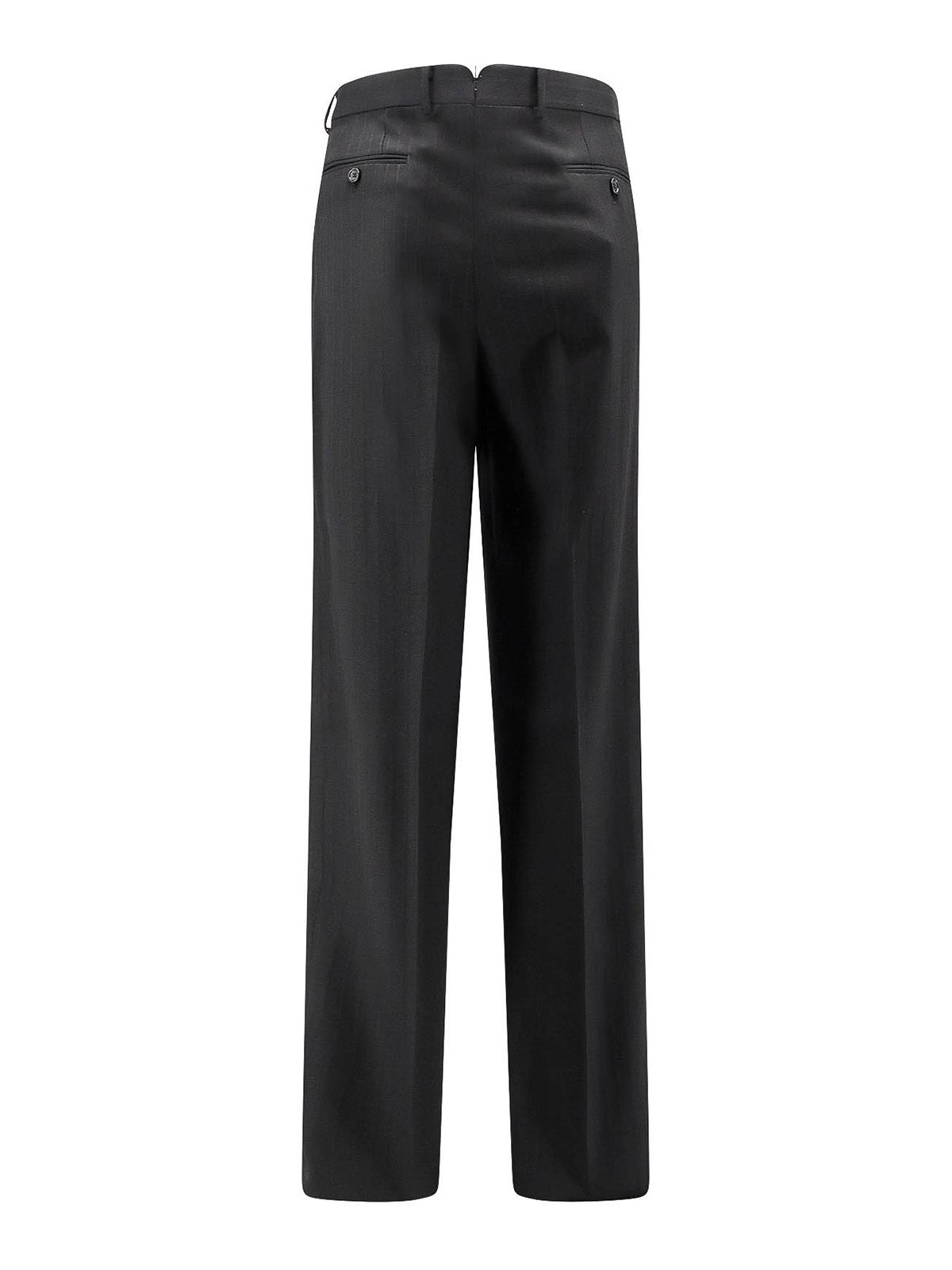 Zip, hook and button closure, pleat detail, striped pattern, side welt pockets, welt pockets with button on the back, striped pattern, 100% wool.