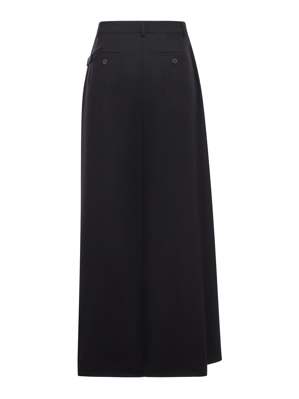 Long culottes- wrap front- belt loops- asymmetrical waistband with button and crossover flap- two buttoned welt pockets on the back- slightly loose fit- color black